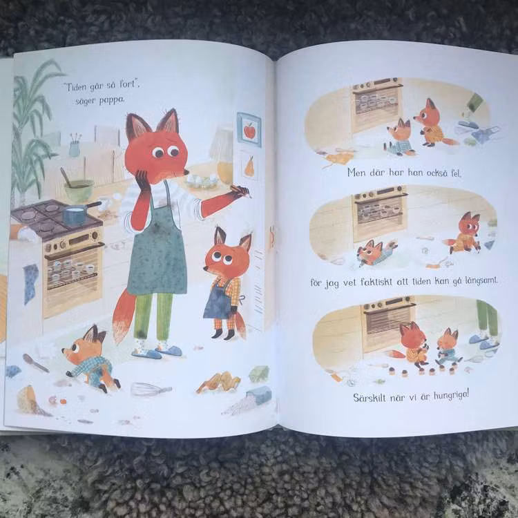 "Bara fem minuter till är en otroligt söt liten barnbok om tiden. I boken får vi följa en liten räv som funderar på tiden. Det är en klockren skildring av vuxenvärldens ständiga stress där tiden är knapp och där man hela tiden ska vidare till nästa grej. Men den lilla räven ser det på ett annat sätt och visar hur mycket tid vi egentligen har och vad man hinner på fem minuter. Det är en hel del i barnens värld.