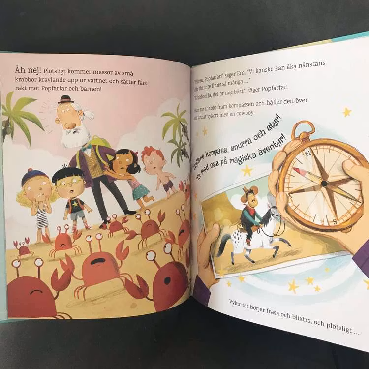 "Underbar bok med härliga illustrationer! Det är härlig och spännande berättelse med många kul äventyr. Det är detaljrika och härligt illustrerade bilder med färger som gör att man blir glad. Språket fungerar fint och det är bra med den återkommande frasen "Gyllene kompass, snurra och styr! Ta oss med på magiska äventyr!" En lätt fras som barnen lägger på minnet och gärna repeterar när kompassen kommer fram och ska ta dem till den plats barnen ser på vykortet."