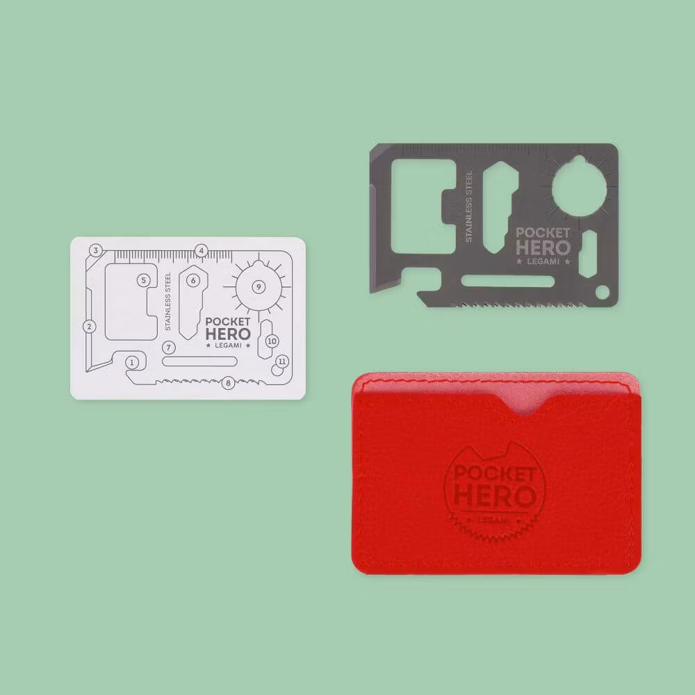 Multiverktyg, stort som ett bankkort, med 11 funktioner i 1 kort. Lägg det i din plånbok, så har du det alltid med dig.