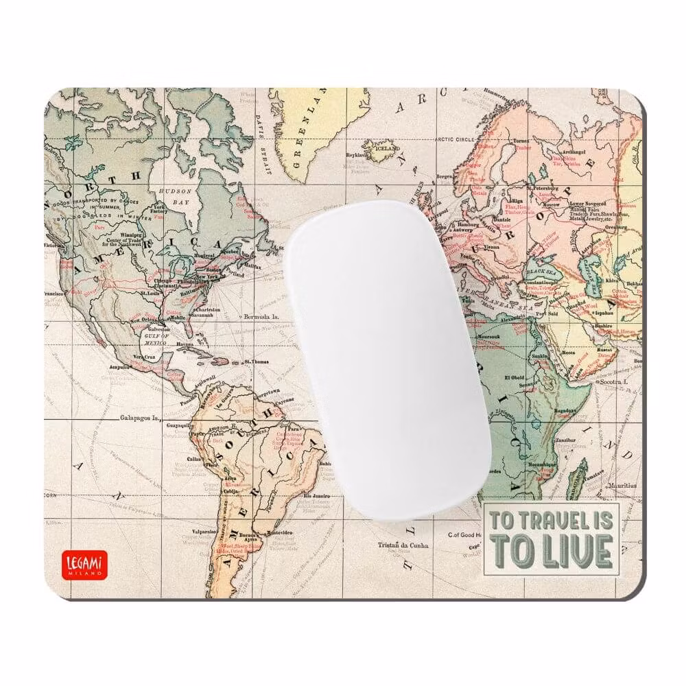 Fin musmatta med motiv av världskartan i mjuka, milda toner.