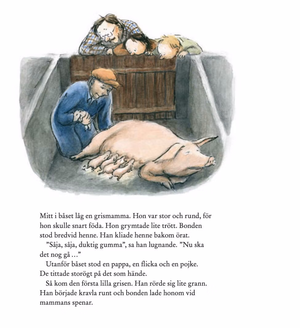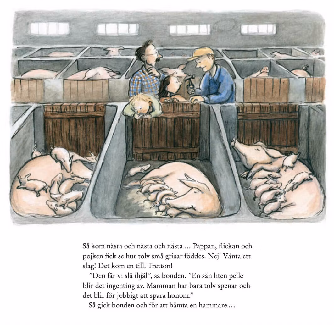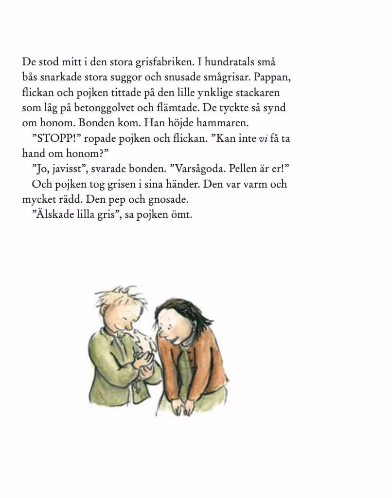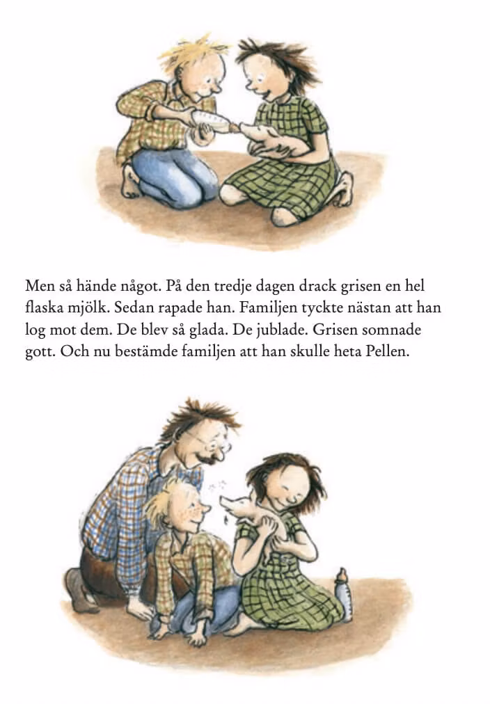 "Boken handlar om två barn som räddar en gris från döden. De tar hand om Pellen som namnet blir och klär grisen i pyjamas och mössa. De har fantastiskt kul ihop. Pellen växer dock och växer och växer. Tillslut kan Pellen bara sitta i badkaret och blir lite deppig. Något måste göras. En fin berättelse om livet och kärlek. Älskar kombinationen av Ulf Nilsson och Eva Eriksson."