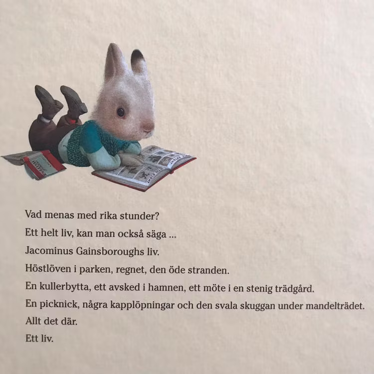 Jacominus Gainsboroughs rika stunder är en hjärtevärmande historia för alla åldrar. I tolv scener där årstiderna växlar får vi följa Jacominus Gainsborough i olika åldrar. Detta är historien om ett liv: dess små saker, dess stora stunder, glädje, sorg, tvivel och prövningar. Rébecca Dautremer förmedlar lyckan att leva genom en ödmjuk liten kanin.