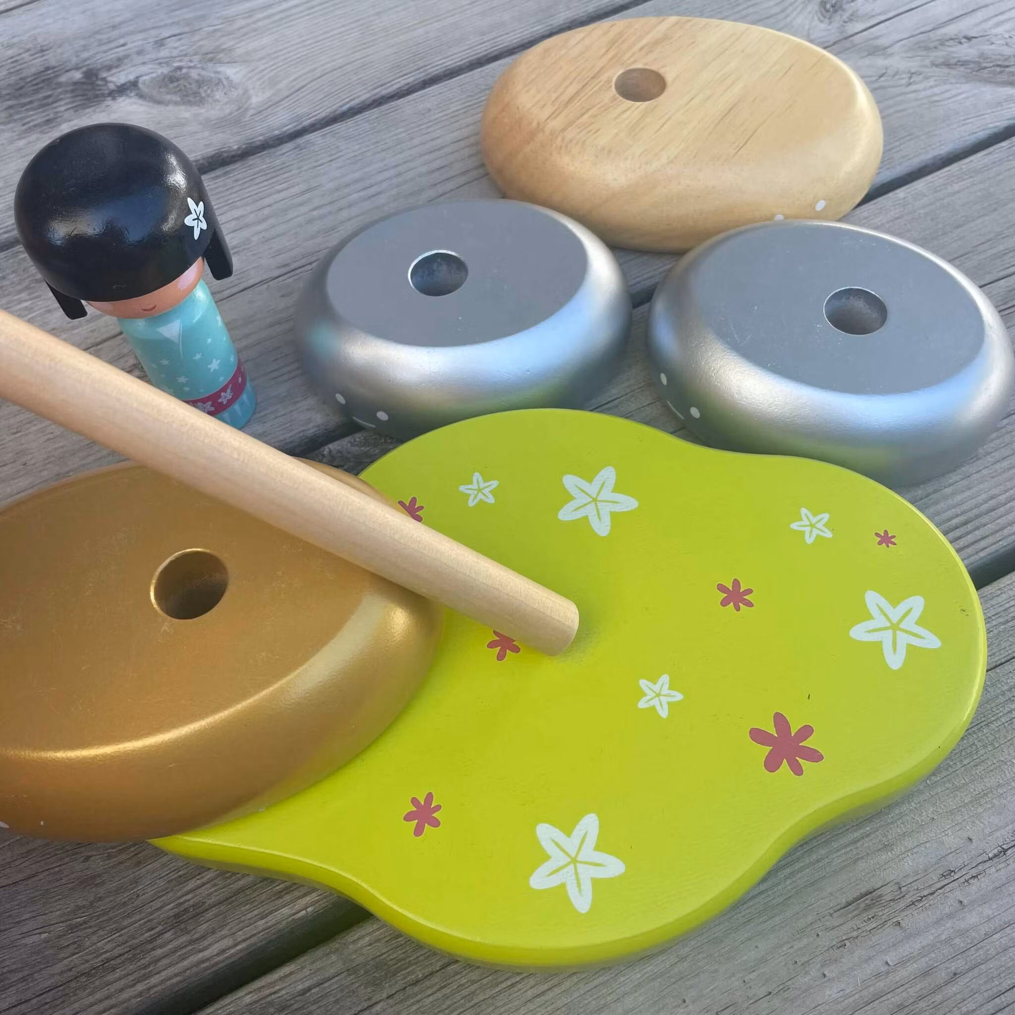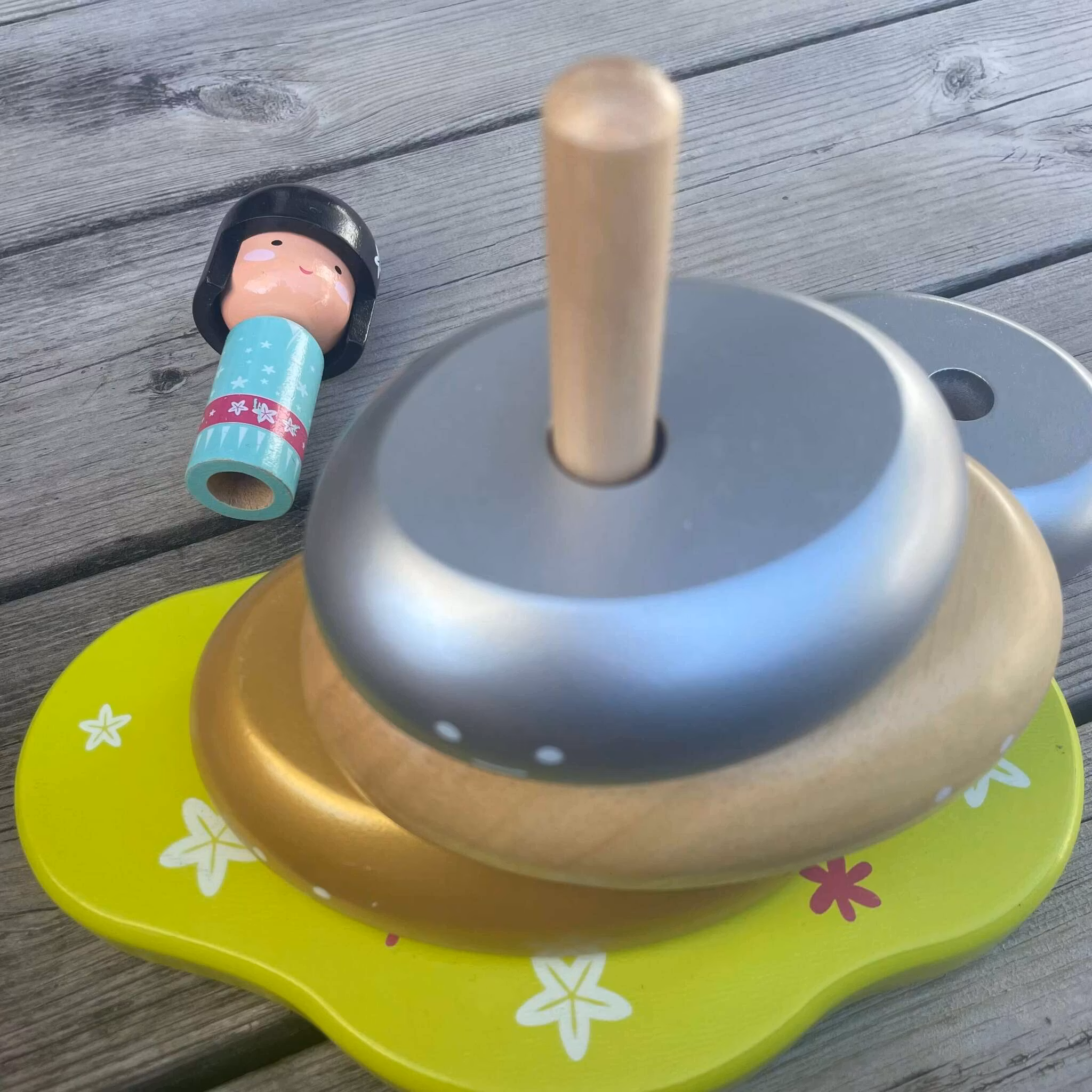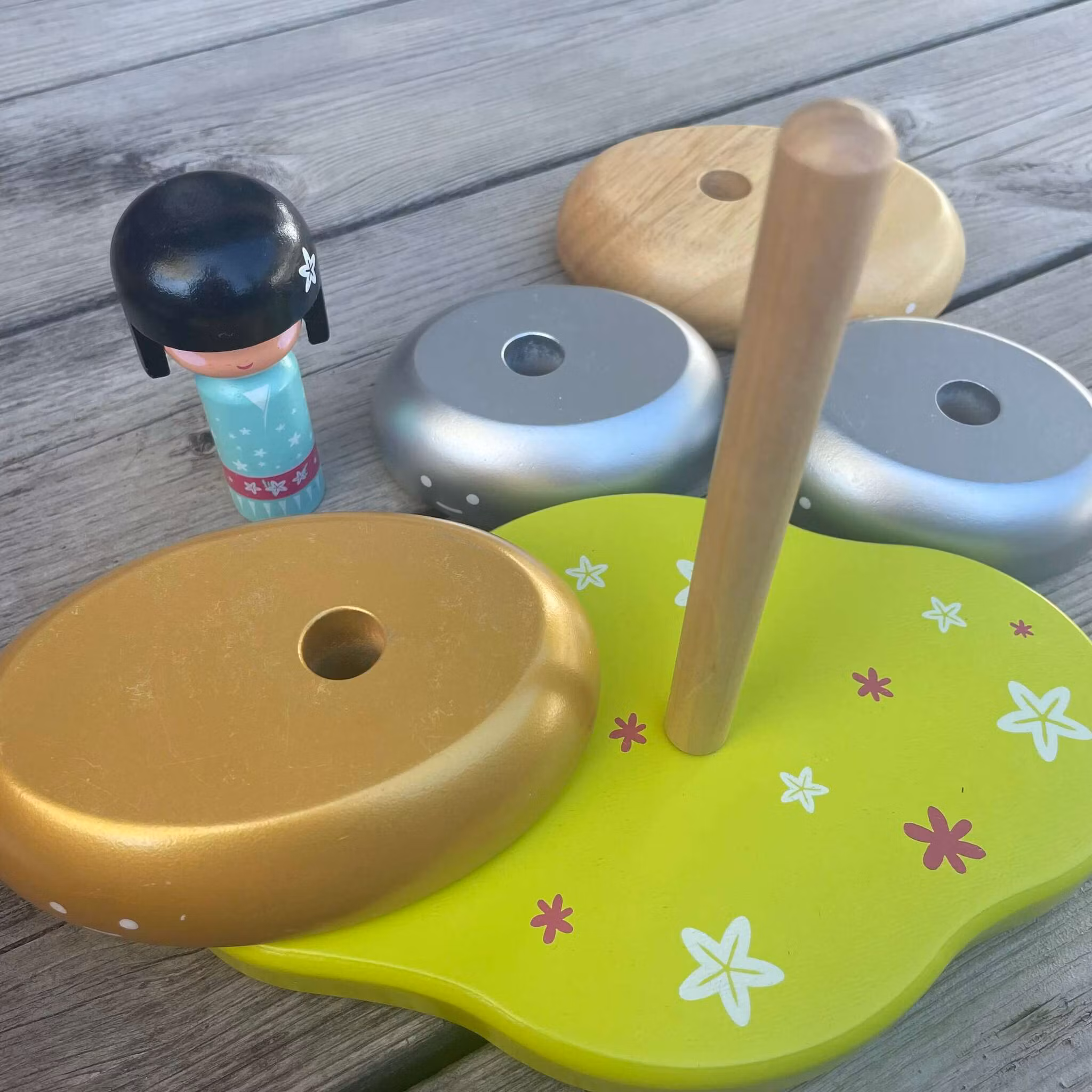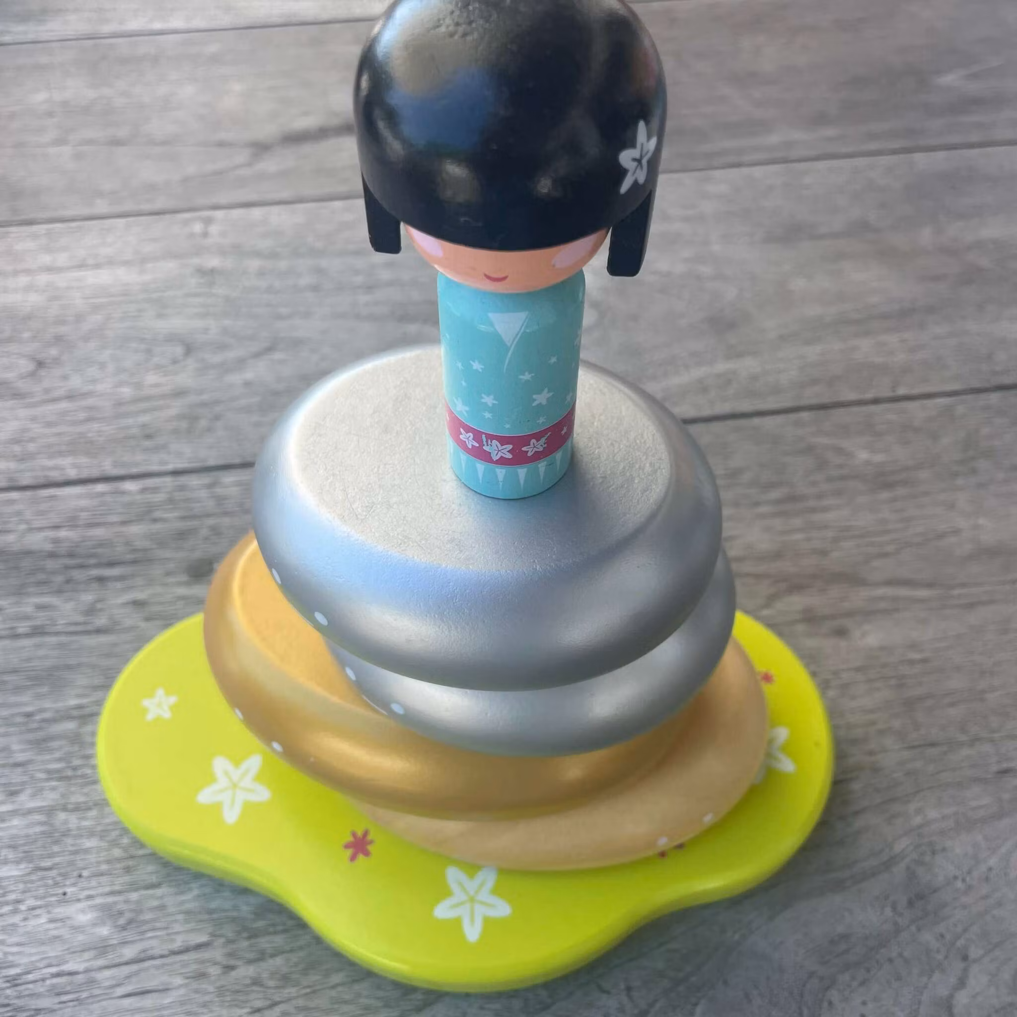 Underbart fin japansk stapellek med en japansk flicka i toppen. Fyra tyngre bitar i trä staplas på pinnen som är böjbar av säkerhetsskäl.