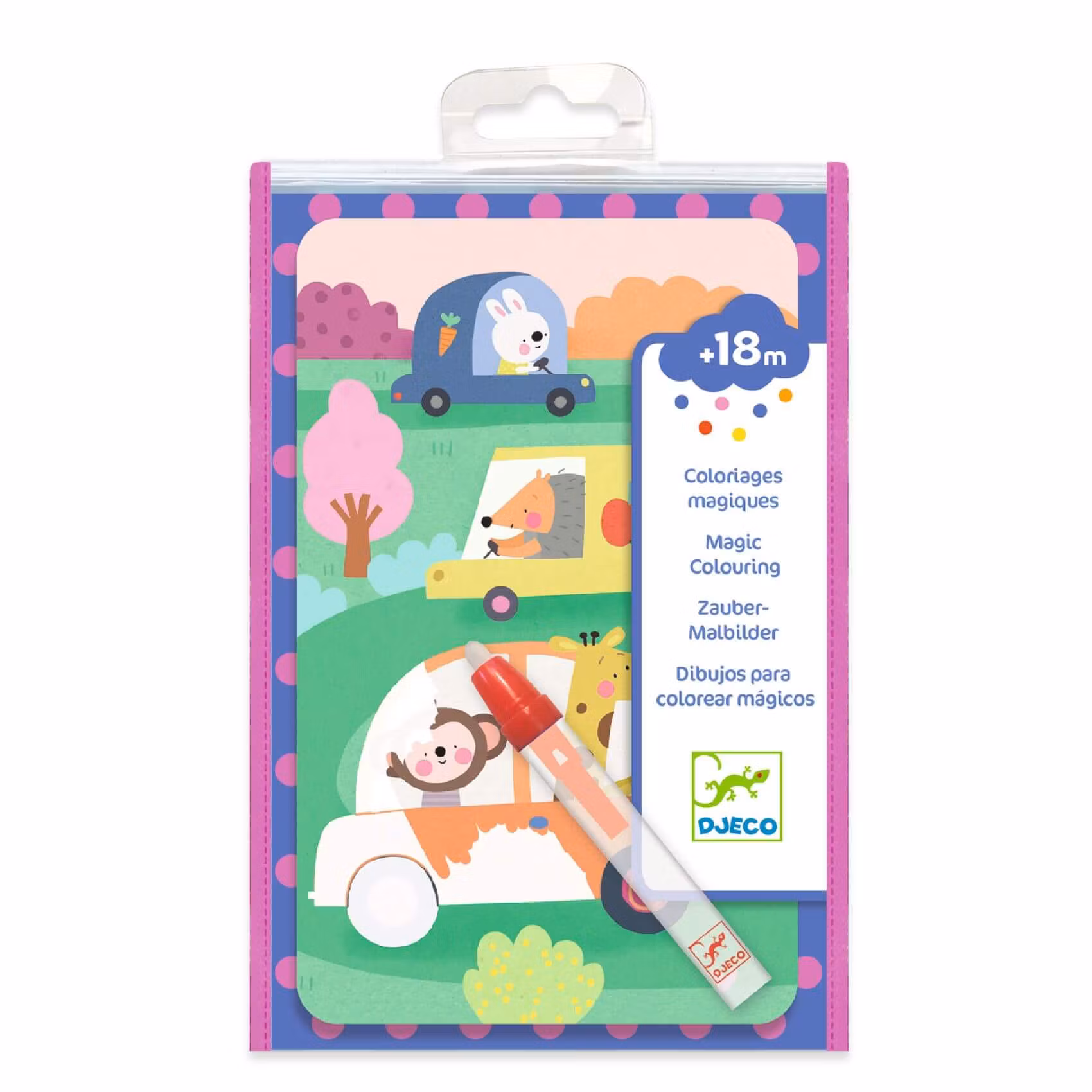 En introduktion till att färglägga, helt baserad på vatten och med söta små bilder på djurfigurer som åker i diverse fordon.