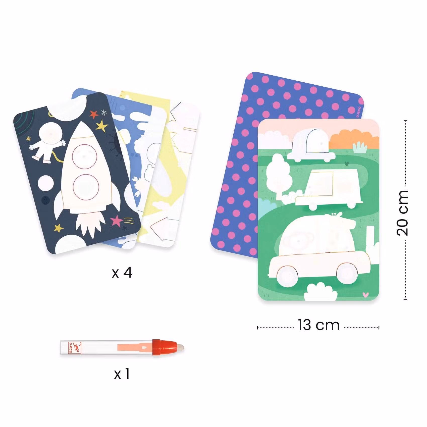 • 4 illustrerade bilder på böjbar plast (20 x 13 cm) med vita områden att måla med vatten