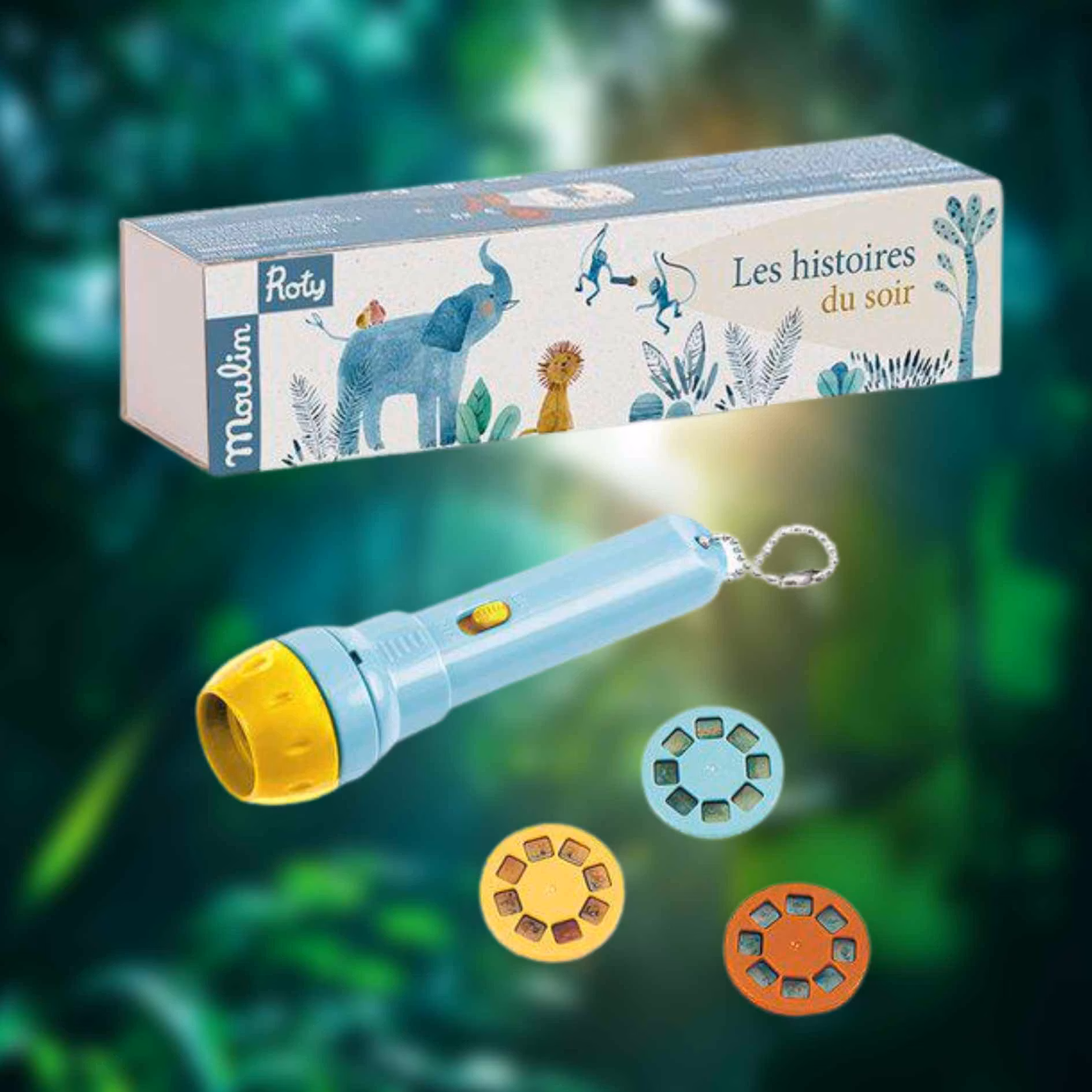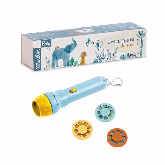 En ficklampa med små diabilder som berättar en saga. Lys med lampan mot väggen i ett mörkt rum och klicka fram de olika bilderna. Kommer med tre olika bildkaruseller.