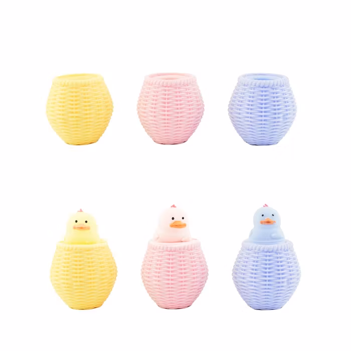 Här finns fyra små kycklingar som har gömt sig i en korg med samma färg. Om du trycker på korgen så kommer kycklingen fram. En rolig liten överraskning.