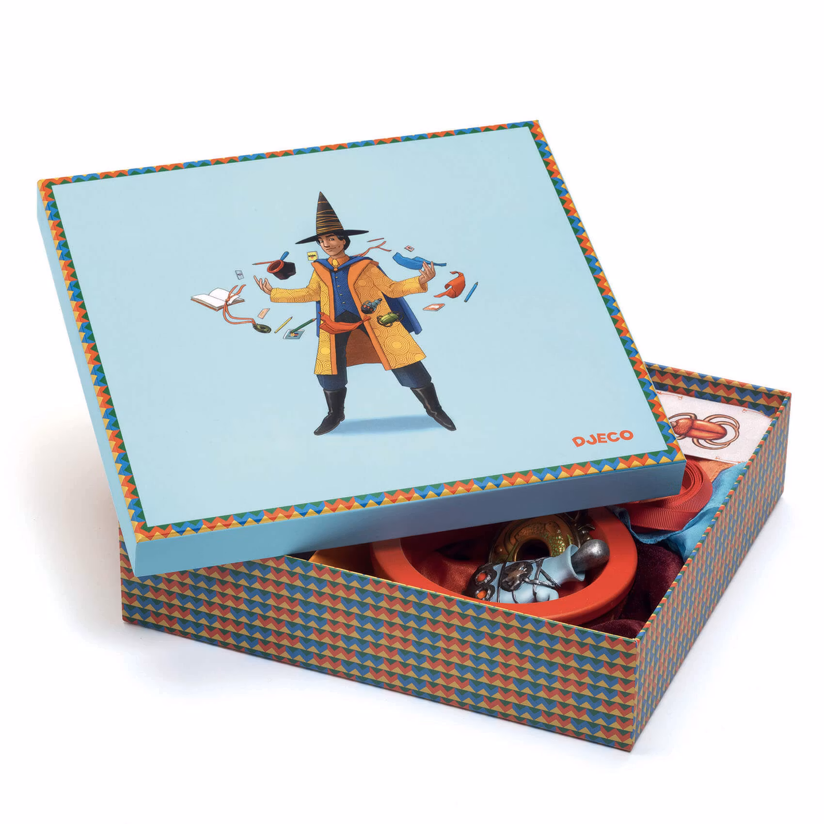 Ett komplett set med 20 olika magiska trick att blända din publik med, du får bland annat trolla bort något, förvandla en sak till något annat, få publiken att se en illusion och förutsäga vad som kommer att visa sig. Materialen och tillbehören till trollkonsterna är utvecklade av professionella magiker och designade av det franska företaget Djeco.