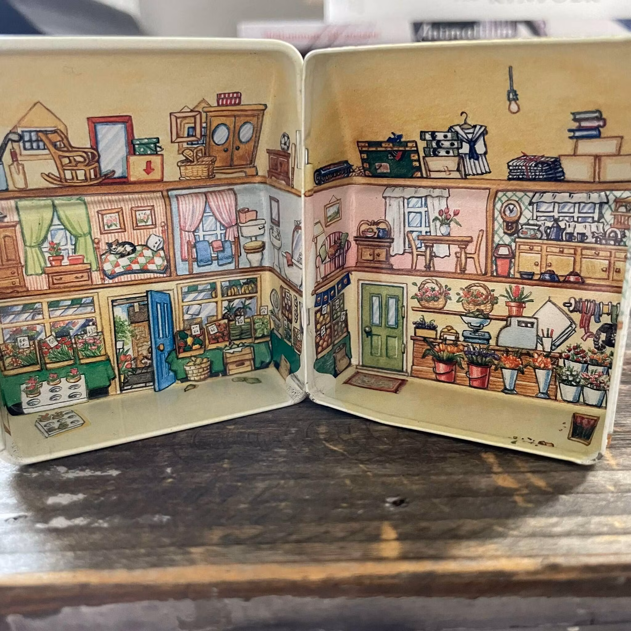 Magiskt söta små plåtburkar som tillsammans bildar en hel liten by. Öppnar du burken ser du insidan av huset. Alla burkar är olika och har olika insida baserat på vilken typ av hus det är. Floristen arbetar med sina blommor inomhus och har visst råkat tappa en kruka på golvet. Bagaren bakar sitt bröd osv.