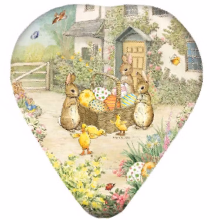 Underbara, fina, hjärtformade påskägg med motiv från Beatrix Potters Pelle Kanin. Det är samma motiv på båda ägghalvorna.