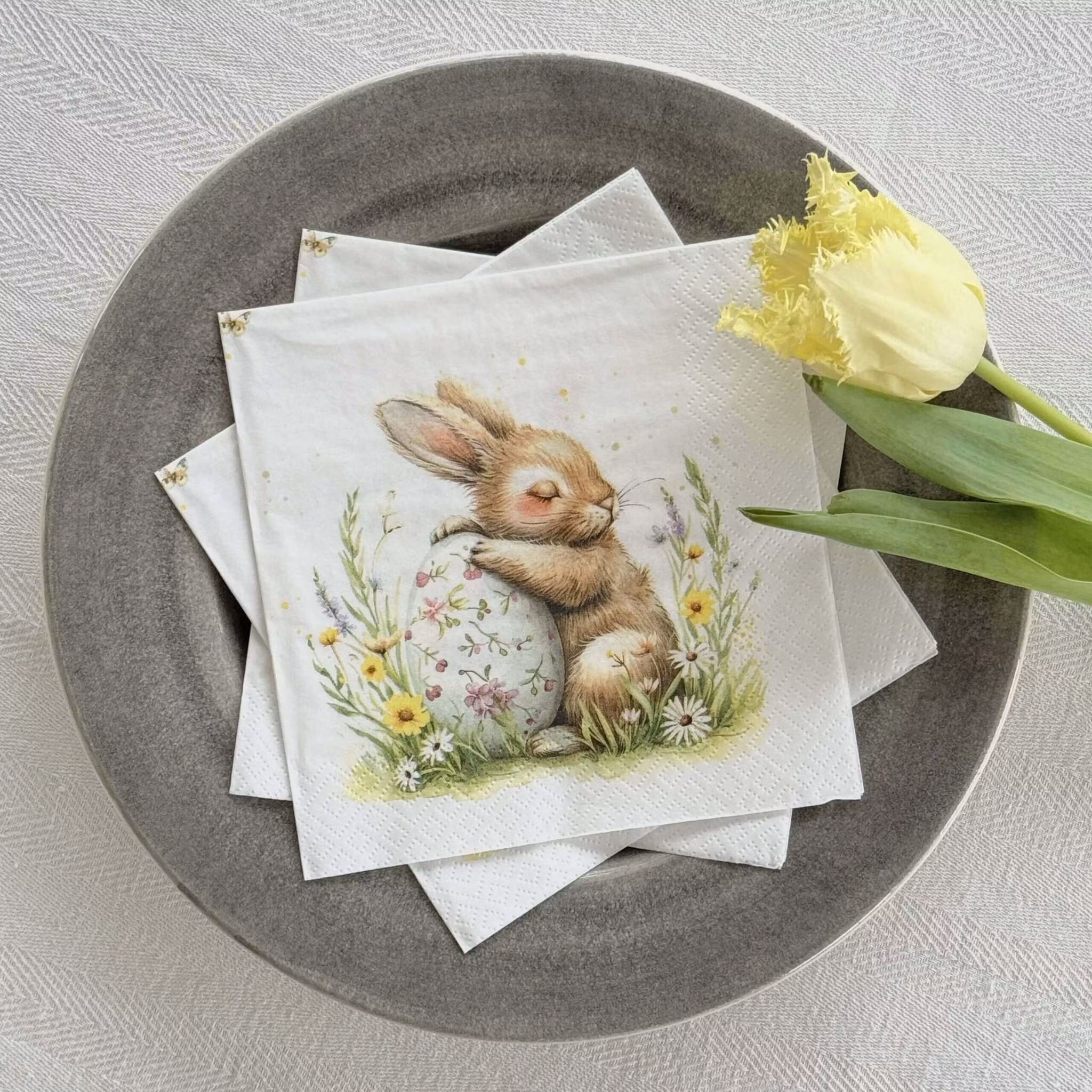 Vackra servetter med den söta påskharen som kramar sitt ägg.