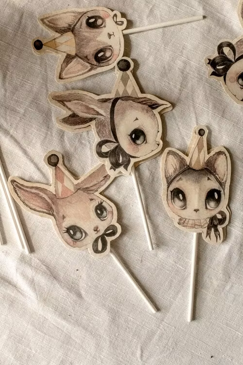 DIY papperspyssel för kalaset.8 dubbelsidiga partykompisar och 16 dubbelsidiga placeringkort. Klipp ut figurerna och var kreativ! Gör din egen vimpel m.m.