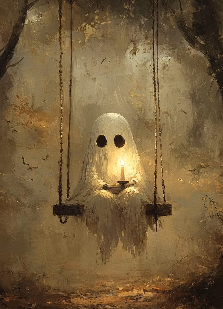 Underbart halloweenkort med det vackra spöket som sitter i gungan och håller i ett stearinljus.