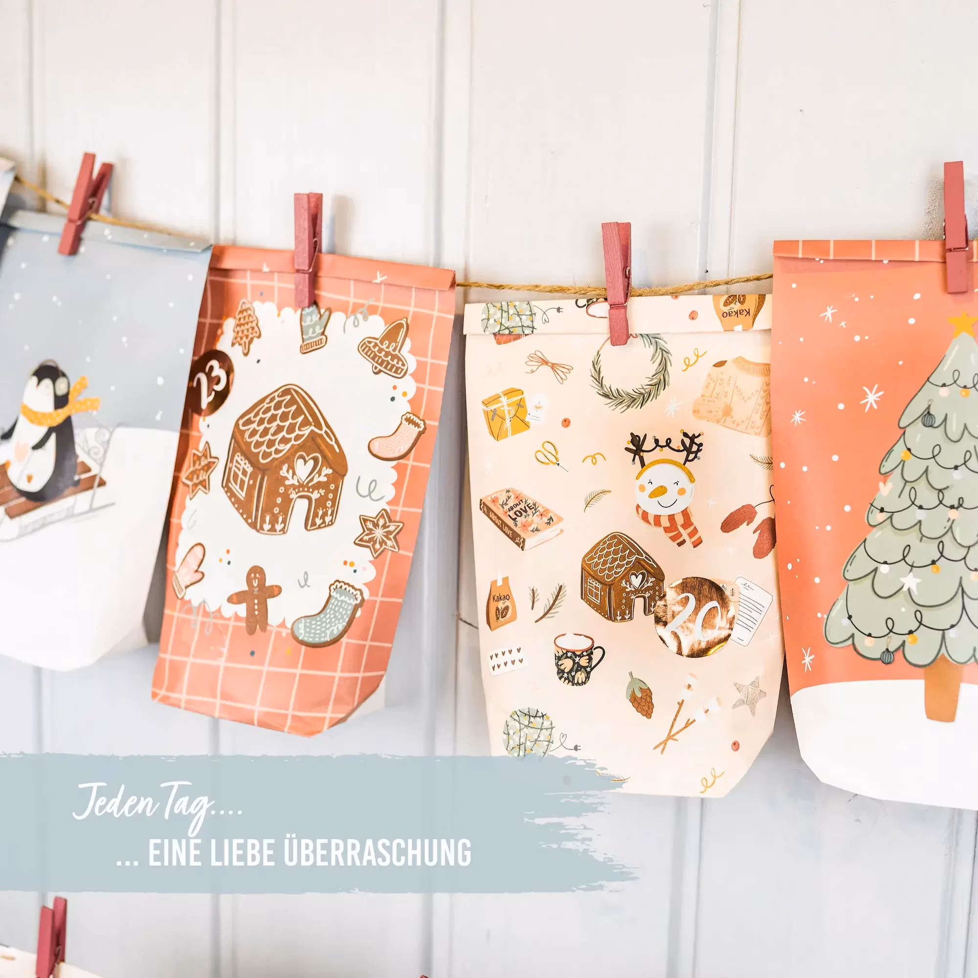 En fantastik adventskalender i form av små påsar som du själv fyller med innehåll. Skapa din alldeles egna julkalender av 24 kraftpapperspåsar.