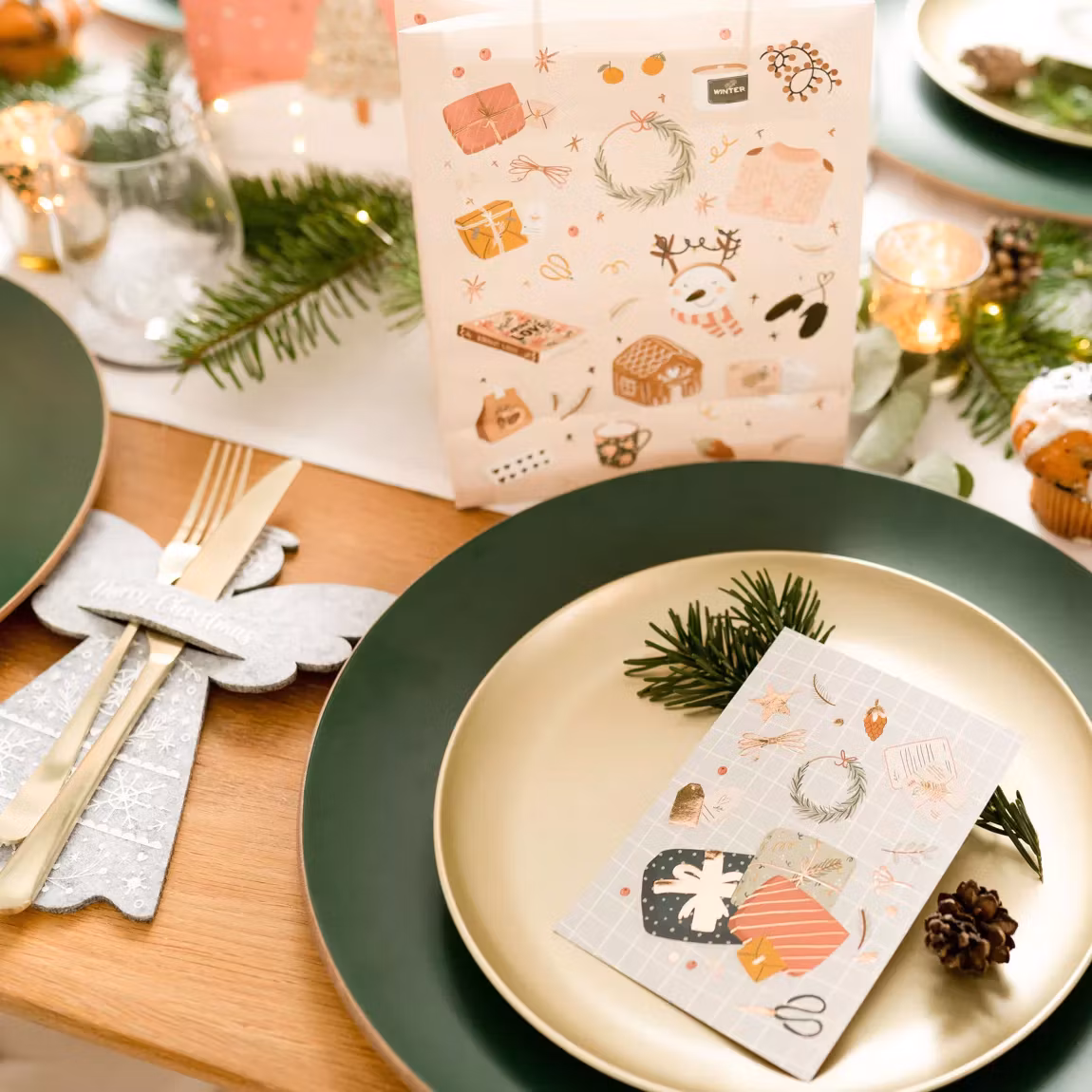 Här finns 6 stycken fina julpåsar med vaxade bomullshandtag och gulddetaljer på motivet. Påsarna är 18cm x 22.5cm x 8cm. Det medföljer ett matchande vykort till varje påse. Påsarna blir vackra under granen eller som praktisk överlämning av en julklapp. Du väljer själv om du vill använda vykorten till att skriva en hälsning till den som ska ta emot julklappen eller om du vill skicka dem med en julhälsning till en vän.