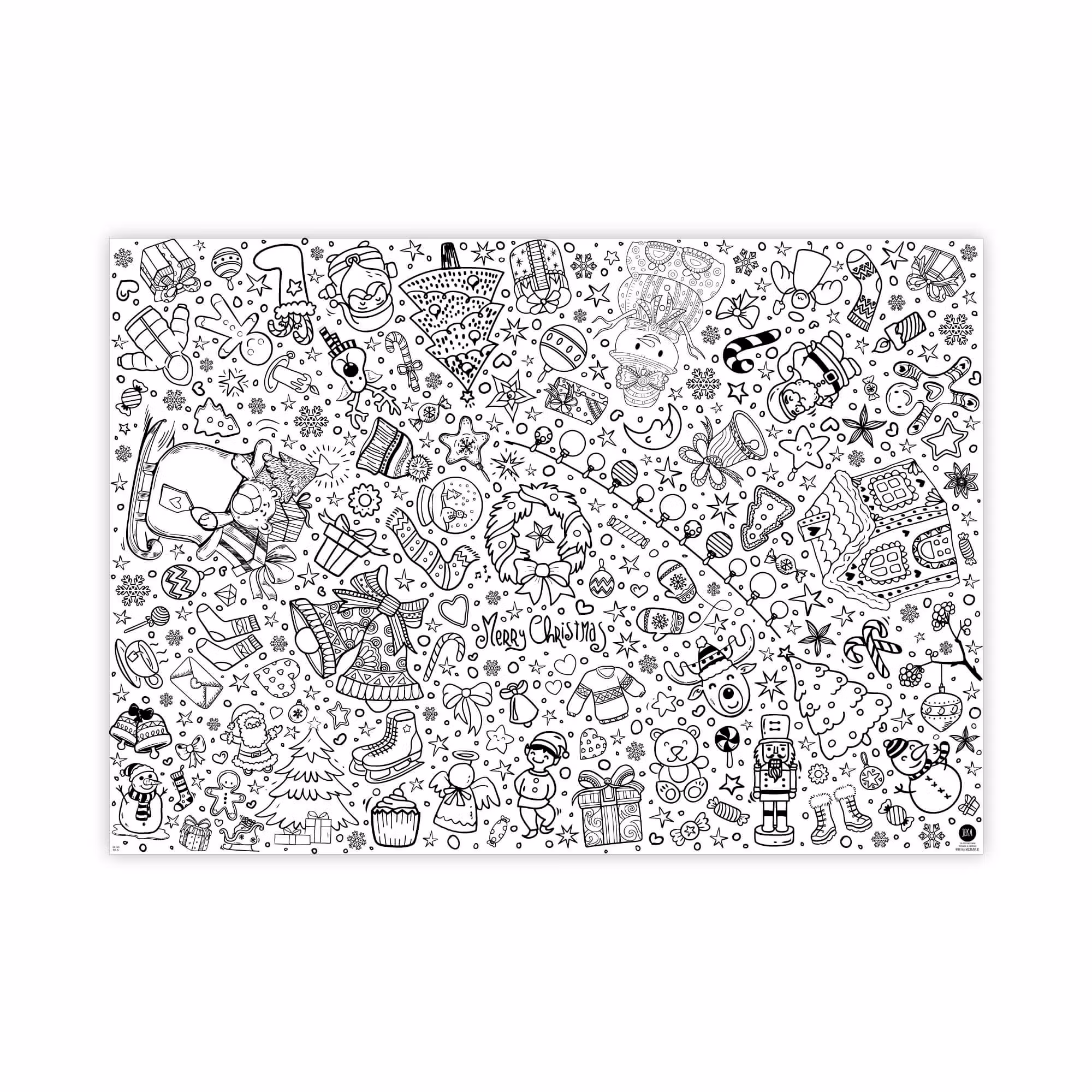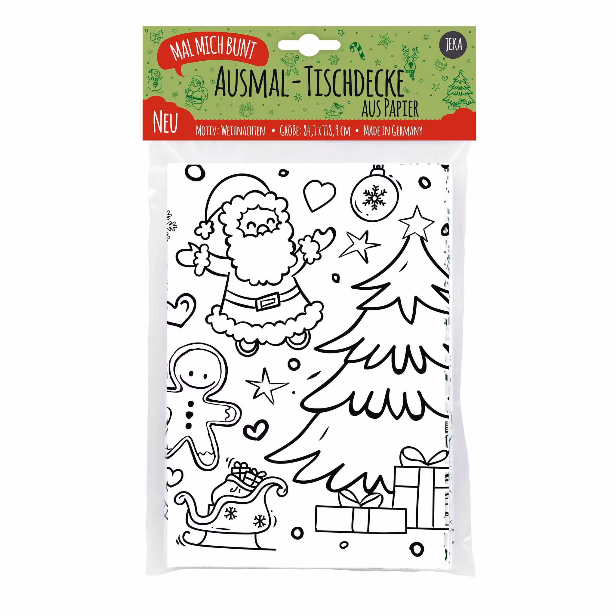 På pennorna, färdiga - börja rita. Här är det helt ok att rita på duken. Perfekt för adventsfikat eller julfesten tillsammans med familjen: På denna pappersjulduk kan du hitta massor av roliga saker att färglägga.