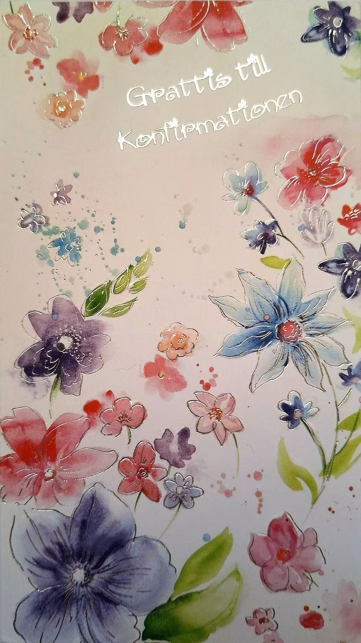 Härligt konfirmationskort med färgsprakande blommor. På kortet finns texten ”Grattis till konfirmationen”. I kortet finns ingen text. Kuvert medföljer.