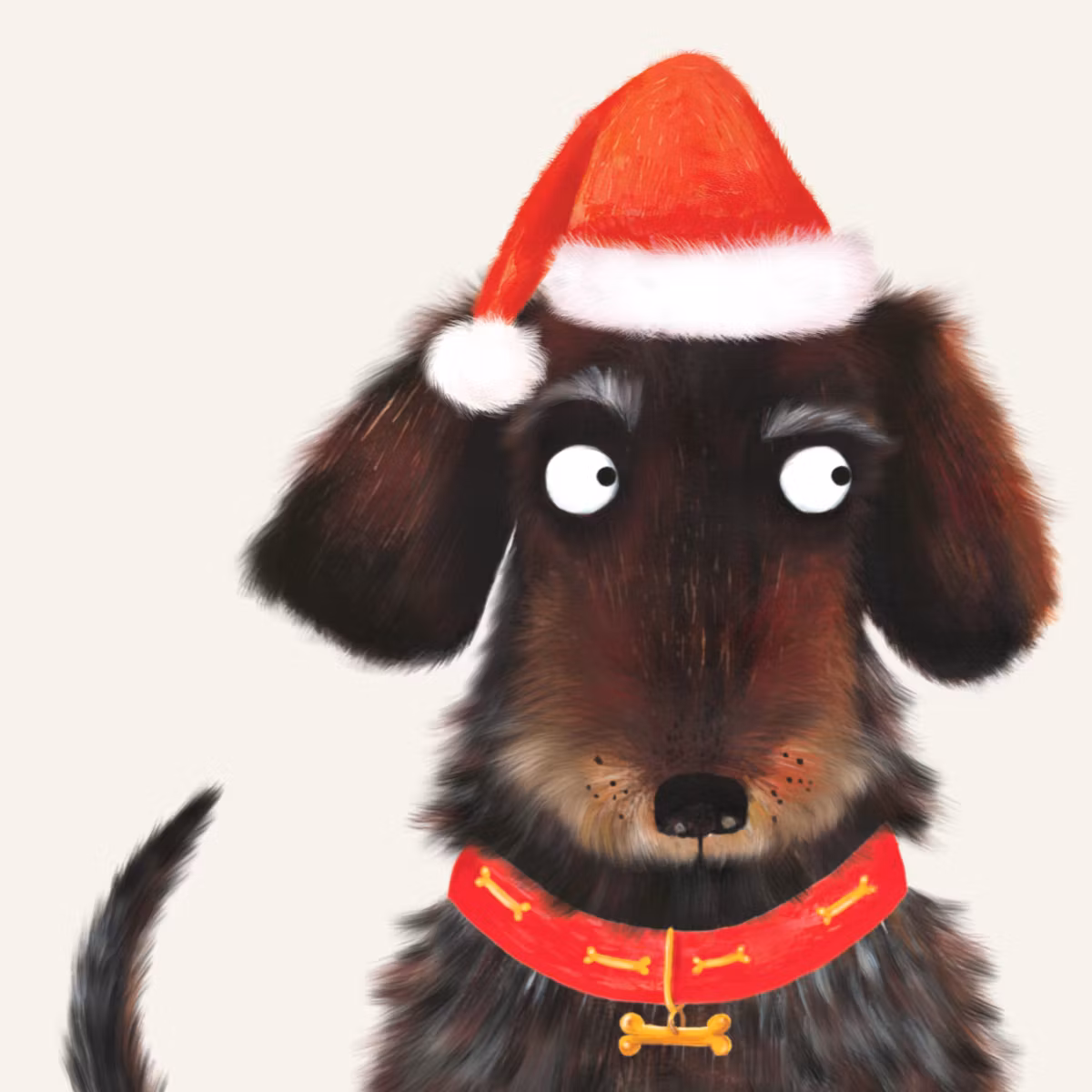Underbart julkort med den söta taxen som är julklädd i tomteluva. Det finns ingen text varken i eller på kortet. Det medföljer ett kuvert.
