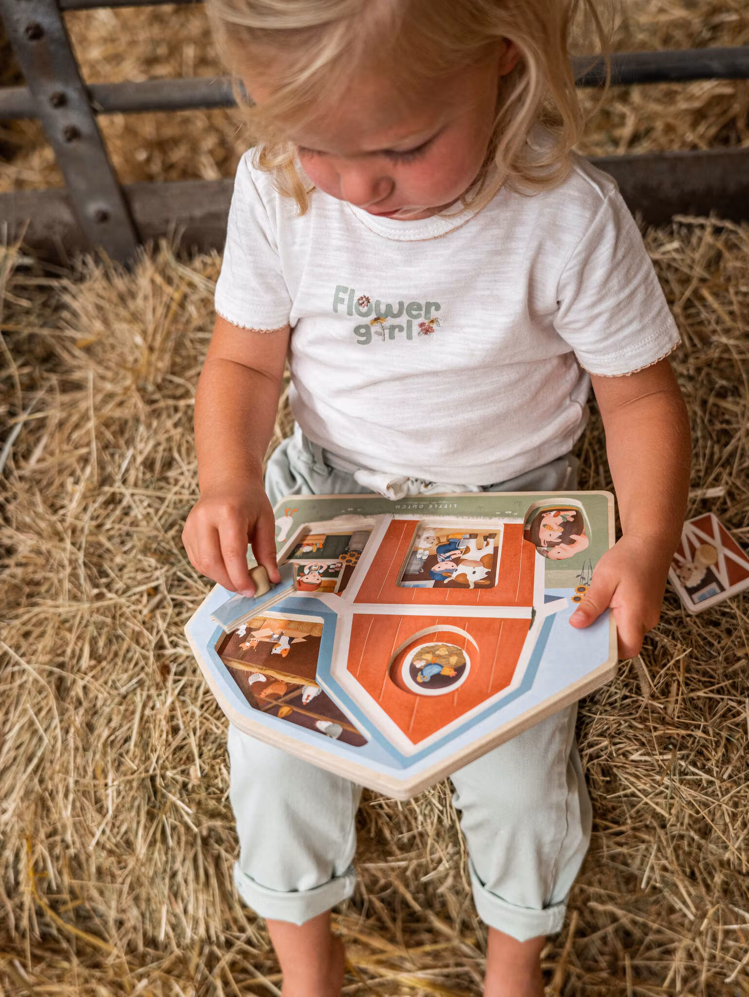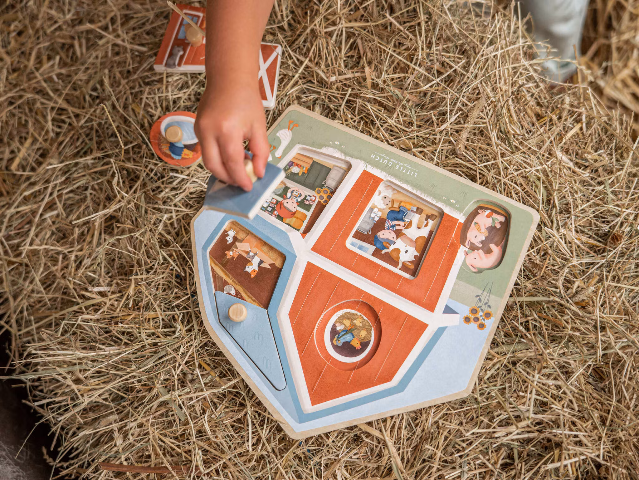 Här finns ett riktigt fint och roligt träpussel. Pusslet är format som en lada och lyfter du på bitarna ser du vad som gömmer sig bakom luckorna.