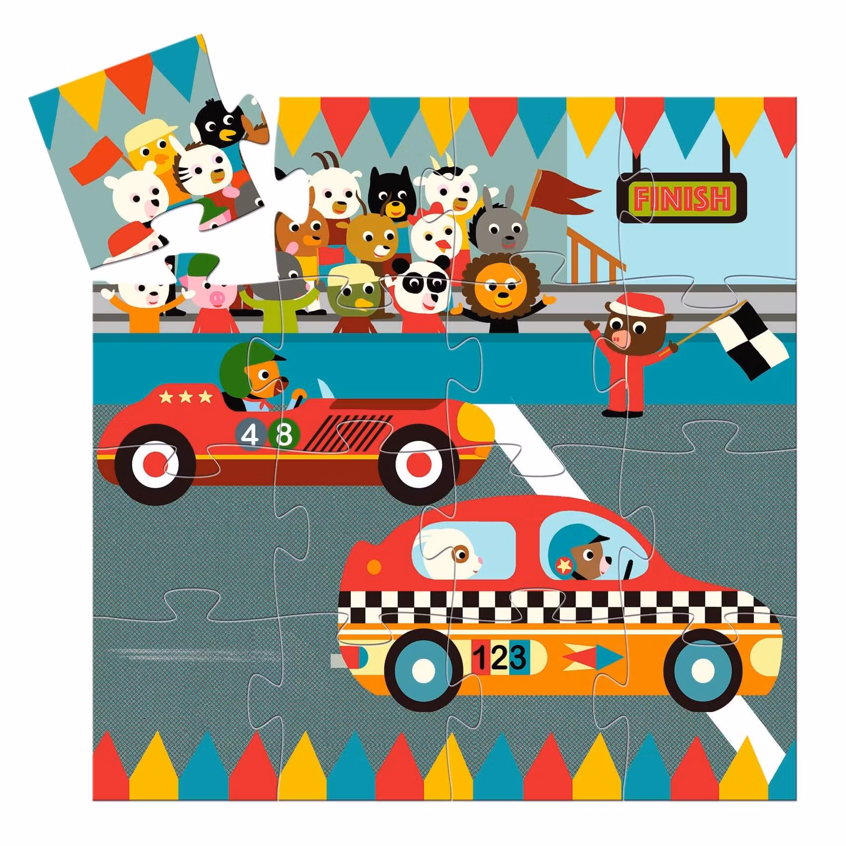 Pusslet har 16 bitar och det färdiga motivet har racebilstema.