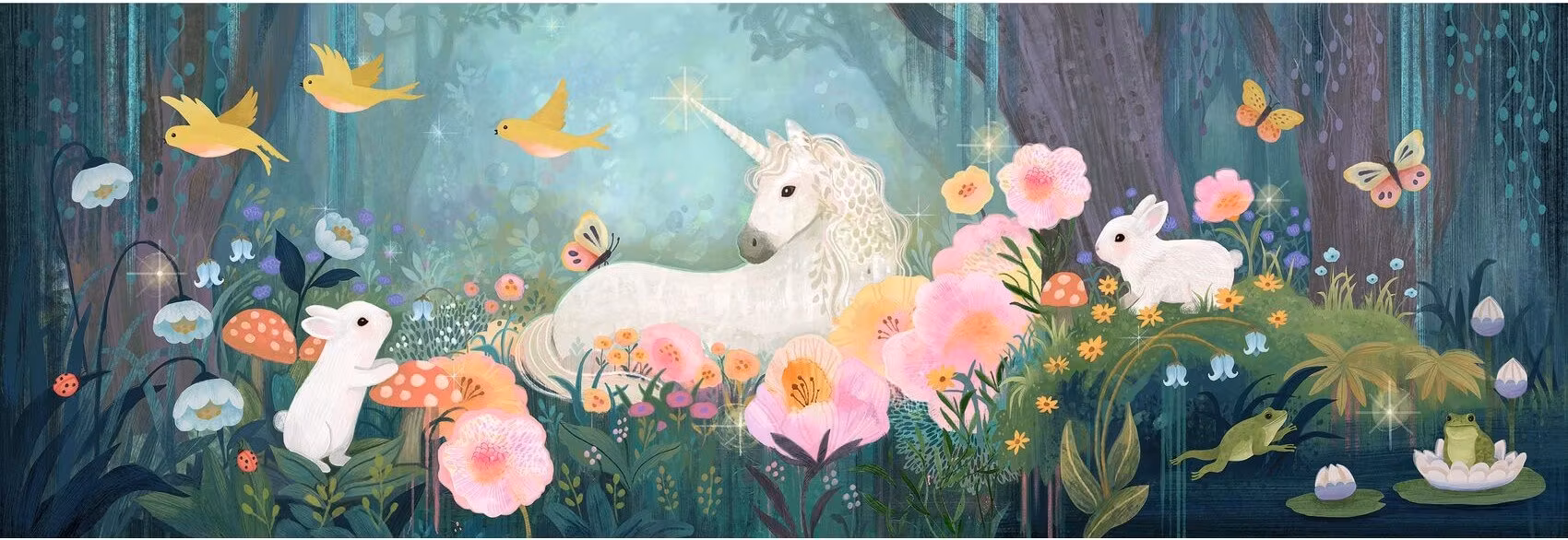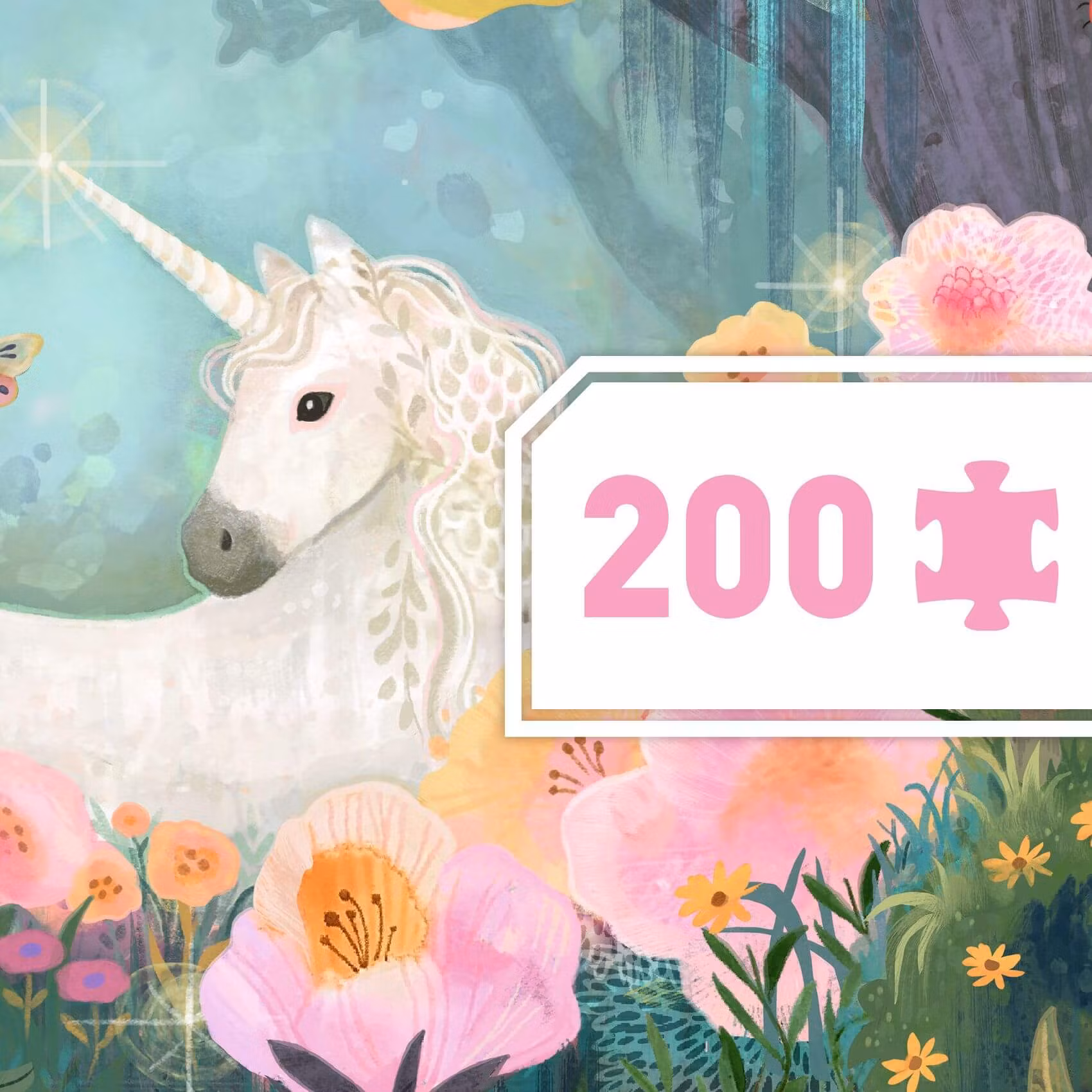 Pusslet har 200 bitar långsmalt format som både gör det lätt nå alla delar och gör det roligt att lägga. Motivet föreställer en magisk scen från en liten glänta i skogens utkant, där en fantastisk enhörning vilar bland blommor med sina söta djurkompisar.