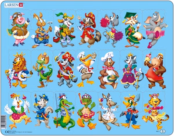 Här finns många djur som har olika kläder på sig. Vad tror du att de gör? Jobbar de med olika saker, i så fall vadkan de arbeta med?