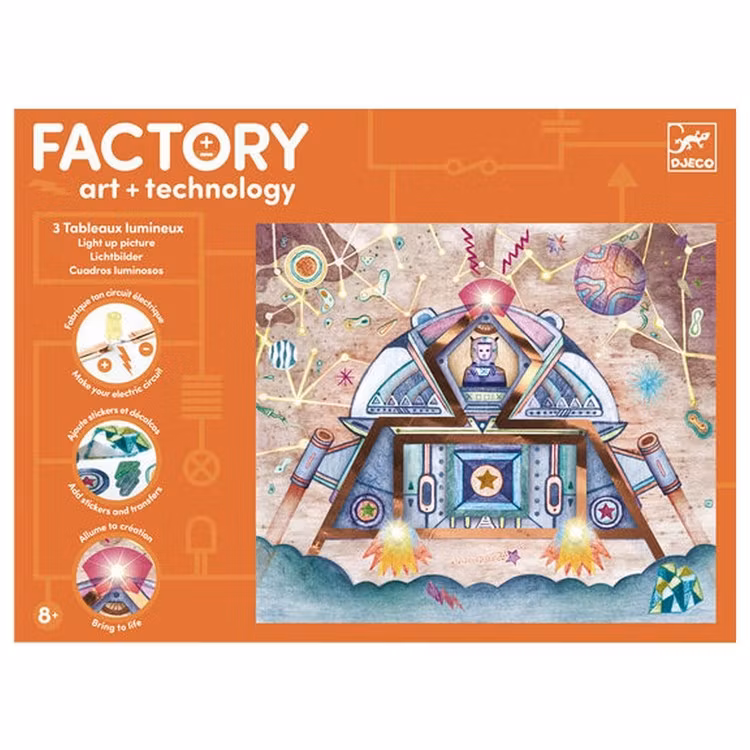 Här får du en lysande blandning av pyssel och vetenskap. Med hjälp av elektrisk tejp och smarta strömbrytare får du chansen att lära dig mer om hur el fungerar. samtidigt som du skapar en fantastisk tavla. Bygg ihop de små lamporna med tejpen och dekorera sedan med de vackra dekaler som följer med i lådan. Låt inspirationen glöda och njut av wow-faktorn! Köp själv eller ge bort till ett annat litet ljushuvud!