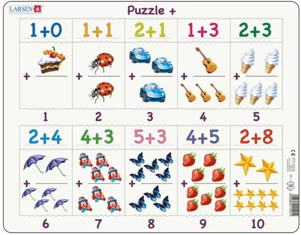 Här gäller det att lära sig räkna med addition. 10 bitar har tal som ska räknas ut och 10 bitar visar talet med bilder. Det gäller sen att para ihop rätt bitar med varandra.
