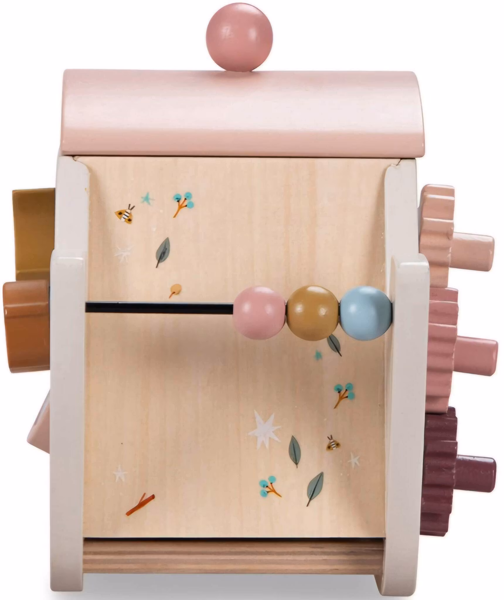 Underbart vacker aktivitetsleksak i form av en tekanna i trä med fina, milda färger. Var och en av de fyra sidorna har olika delar att öva din motorik.
