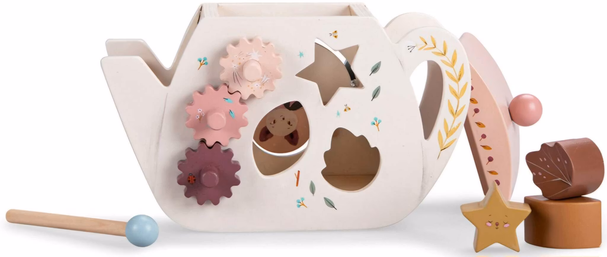 Underbart vacker aktivitetsleksak i form av en tekanna i trä med fina, milda färger.