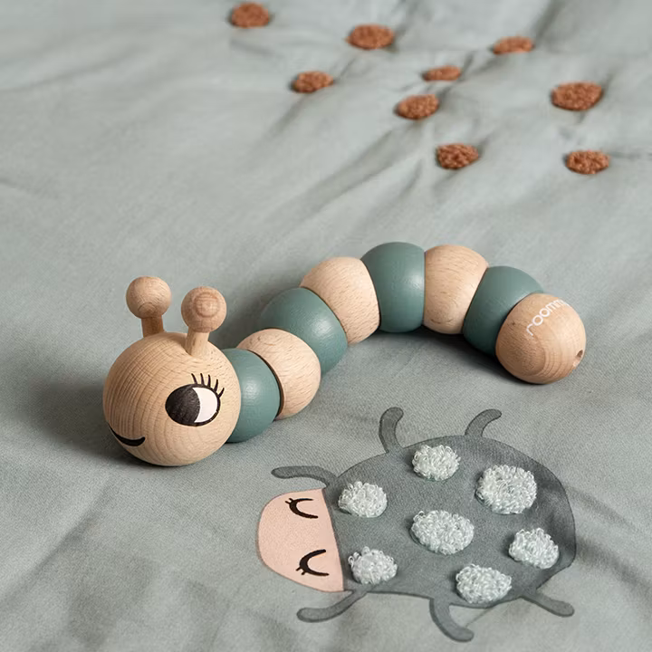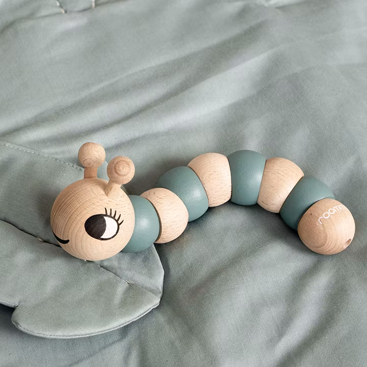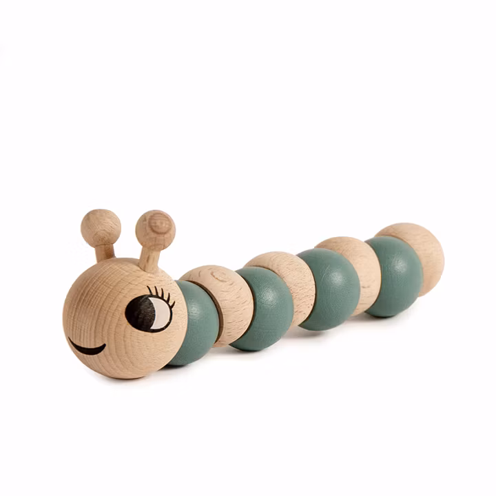 En rolig träleksak med den söta larven med små antenner och en segmenterad kropp som går att vrida till olika ställningar. Den söta larven eller masken har vartannat segment av kroppen målat i en snygg sjögrön nyans och vartannat segment samt huvudet i den naturliga nyansen av bokträ. Torkas av med en fuktig trasa vid behov.