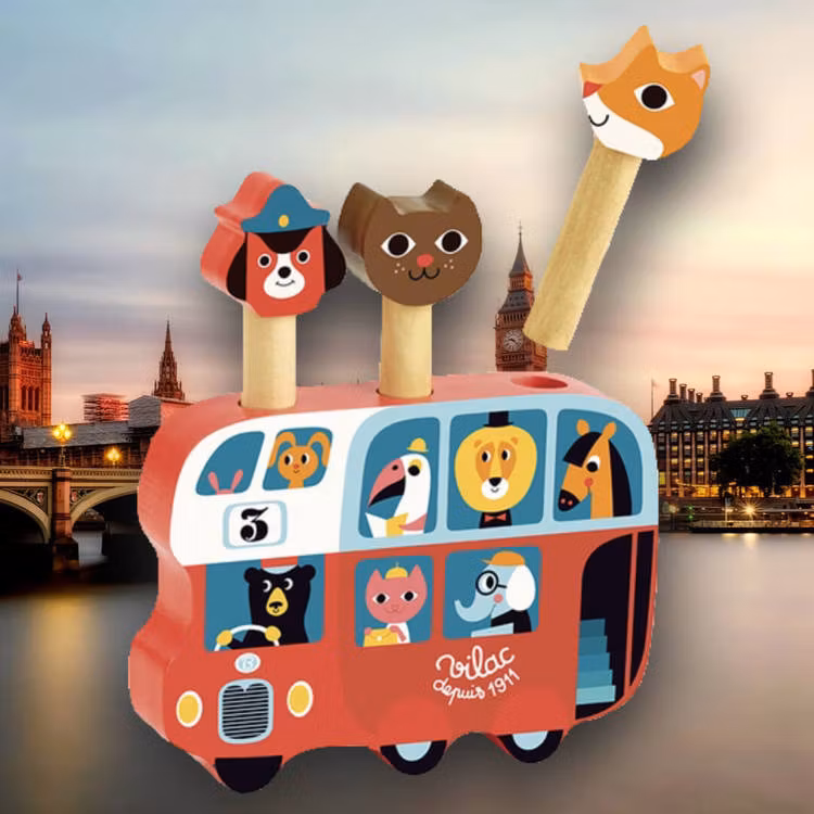 En rolig popup-leksak. En konduktör och två passagerare sitter uppe på bussen.Tryck ner figurerna och släpp så hoppar de upp igen. Perfekt tittut-lek för de små