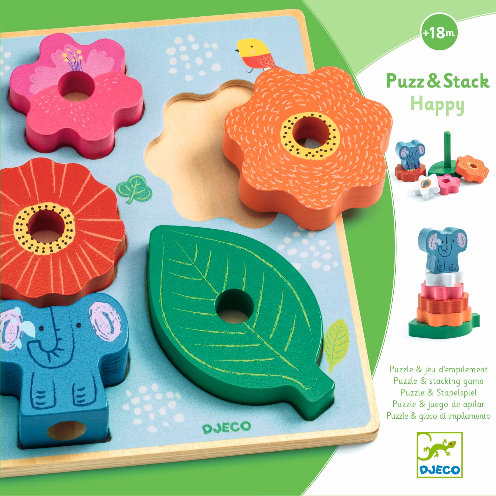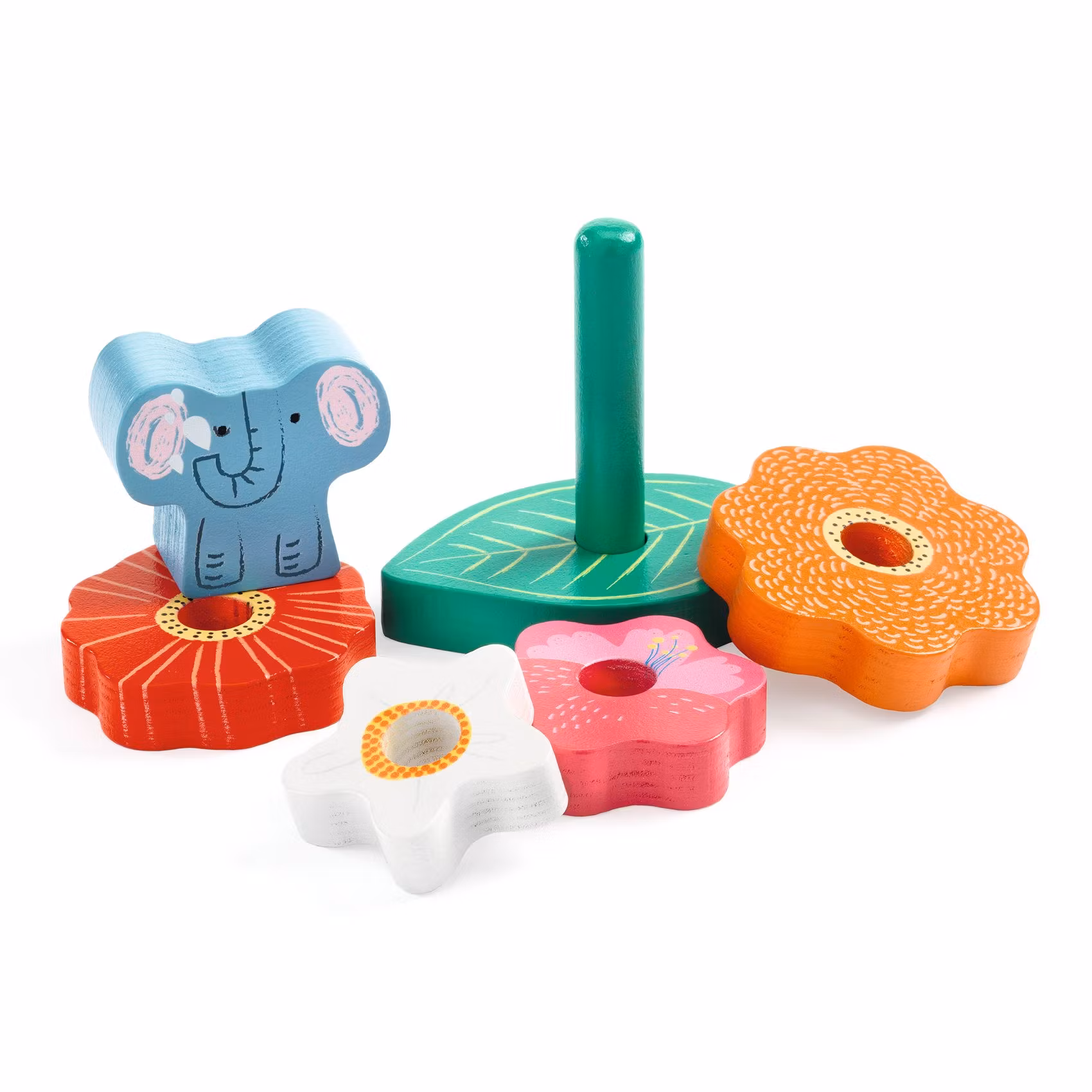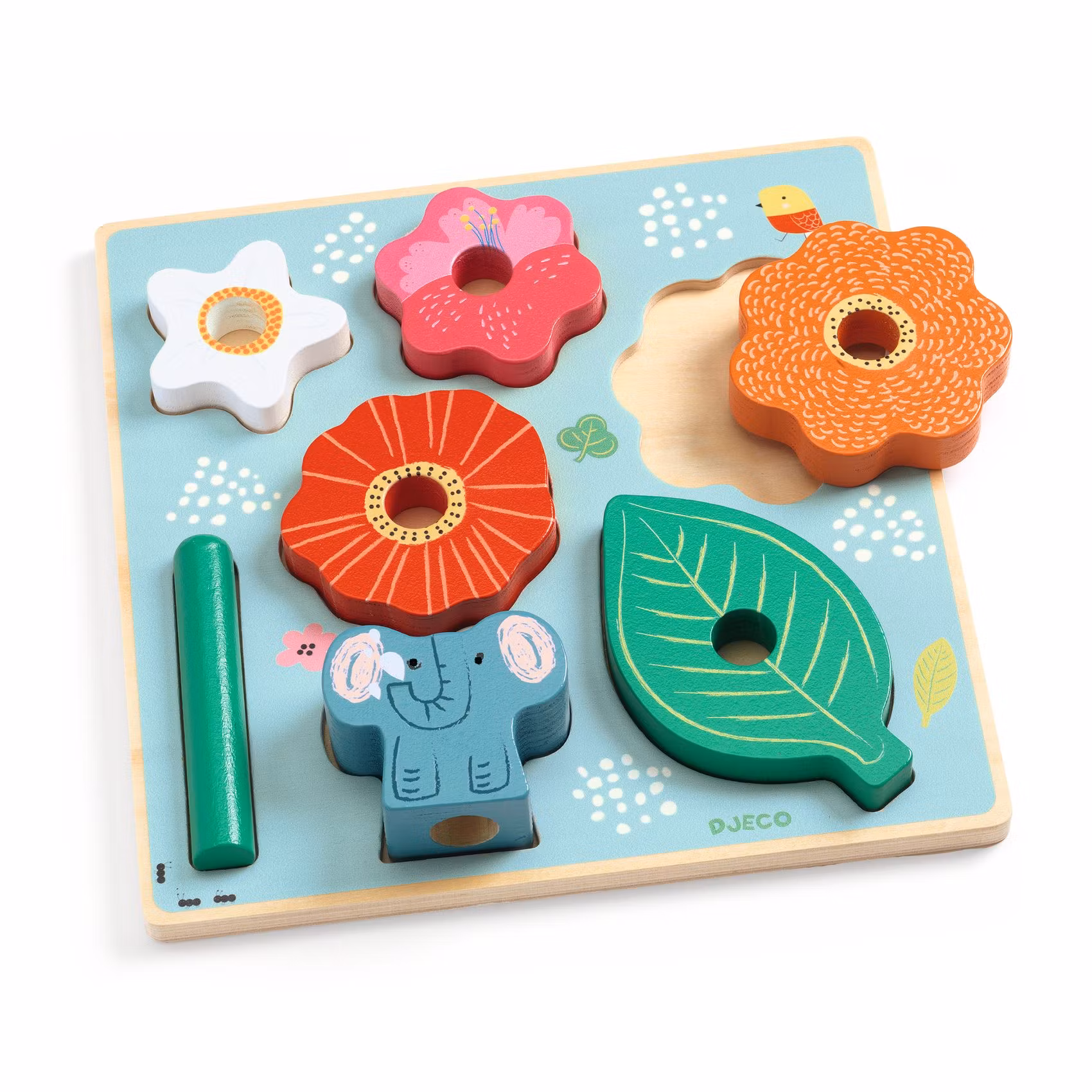 Pusselbitarna är i form av färgglada blommor och en liten elefant. Bitarna är lätta att greppa för små händer och tillräckligt tjocka för att kunna stå upp av sig själva och användas i andra lekar. Lövet kan bli basen för en stapelleksak där du trär blommorna på träpinnen och staplar dem i en snygg pyramid med den lilla elefanten på toppen. Pusslet är tillverkat av FSC®️ certifierat trä och kommer i en praktisk och fint illustrerad förvaringsask.
