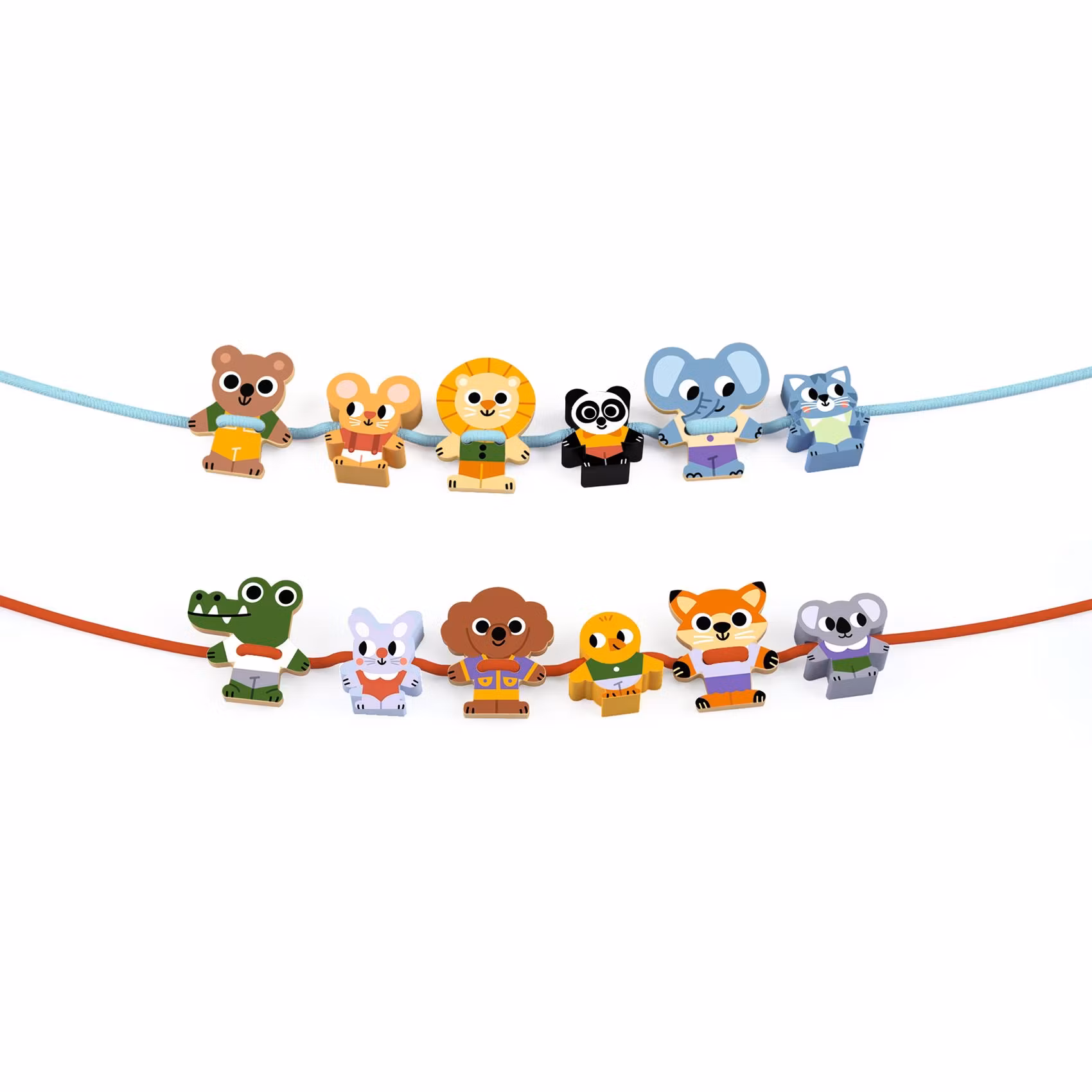 Ett set med små träfigurer som du trär upp på snoddar för att bilda en cirkel av vänner. Ett kul sätt att träna upp koordinationen och finmotoriken genom att trä upp stora pärlor på snoddar som liknar skosnören med långa ändar.