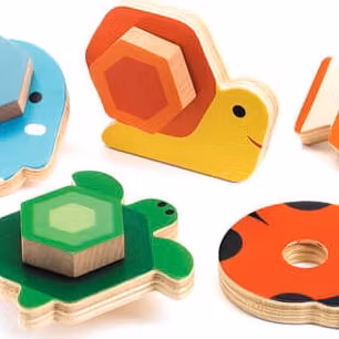Underbart fina träleksaker i set med söta djur i glada färger. Varje djur består av två delar och man skruvar ihop dem. Hjälp nyckelpigan att hitta sin prick, e