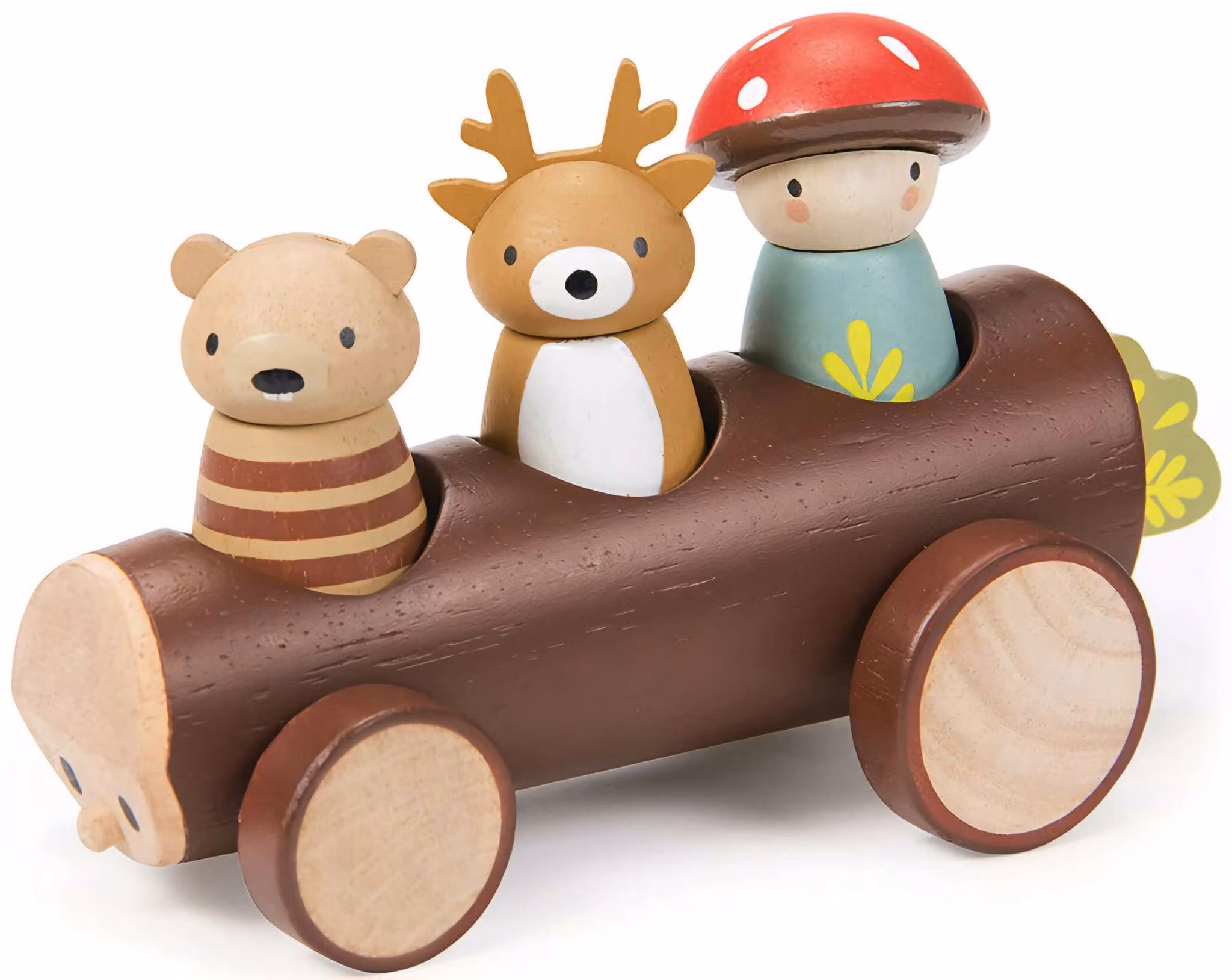 Otroligt söt liten timmerbil som kör runt de tre vännerna Fungi, Woody och Robbie. De tre vännernas namn står skrivet under varje figur.