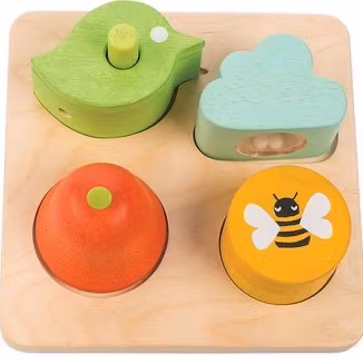 Spännande pussel för de minsta med klossar som låter! Pusslet är i form av en träbricka med fyra fint målade klossar i motiv av en fågel, ett moln, en frukt och ett bi. Roligt att upptäcka de olika ljud som klossarna ger ifrån sig och att passa ihop dom med rätt plats på brickan. Koordinera, lyssna och lär - en upplevelse att njuta av för små barnasinnen! Etiskt tillverkad i återvunnet gummiträ och målad med vattenbaserade färger.