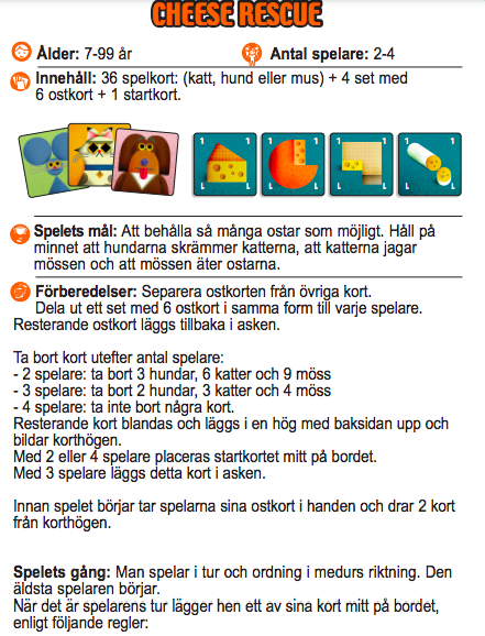 Innehåller 61 kort (36 djurkort, 4x6 ostkort och ett startkort).