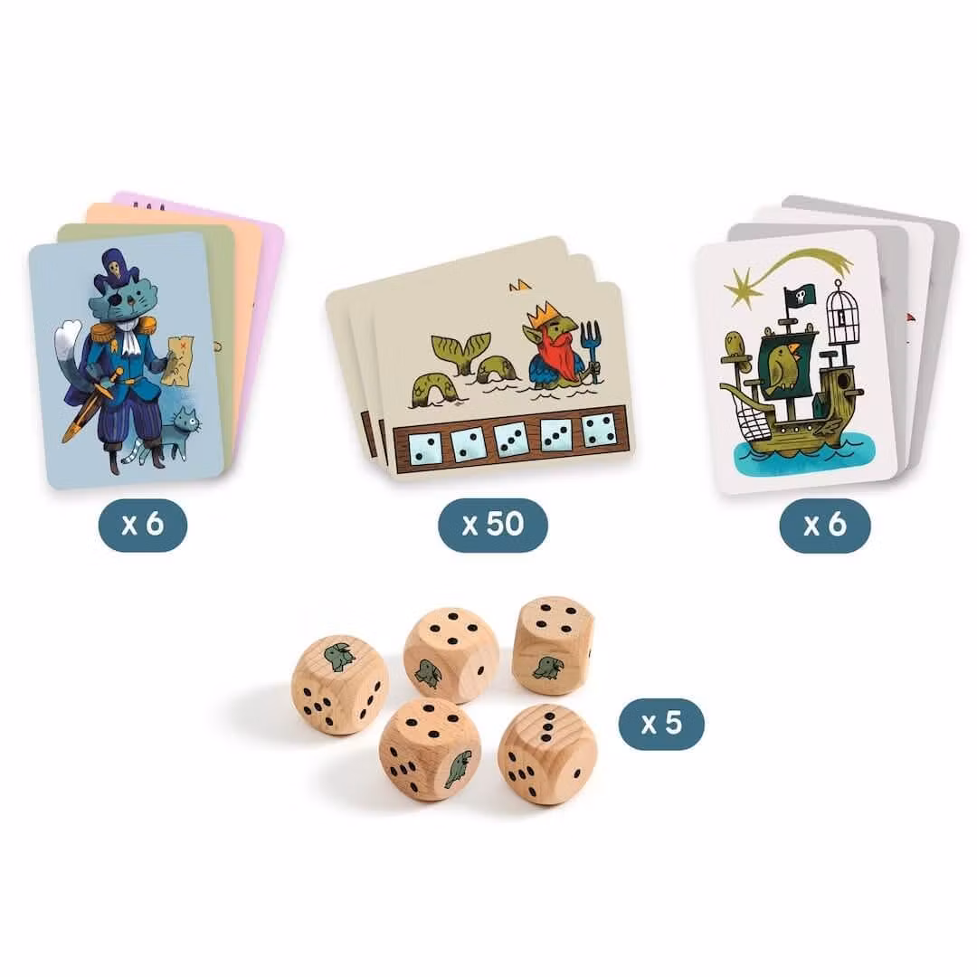 - 62 dubbelsidiga kort (50 utmaningskort, 6 piratkort, 6 piratskepps-kort)