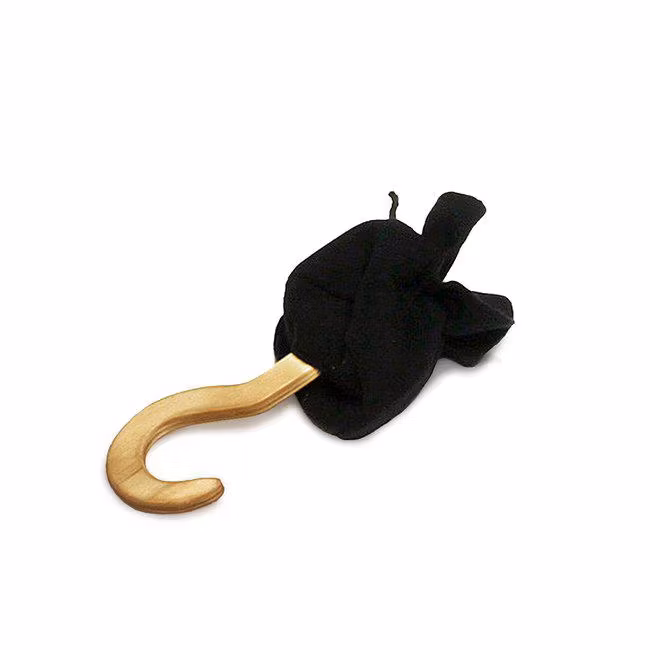 En krok i trä som gör sig bra till piratdräkten. Kroken sitter i en liten tygpåse som man trär över handen och drar åt runt handleden med ett snöre. Ett handtag på insidan gör kroken enkel att hålla på plats. Obehandlat trä och 100% bomullssammet.