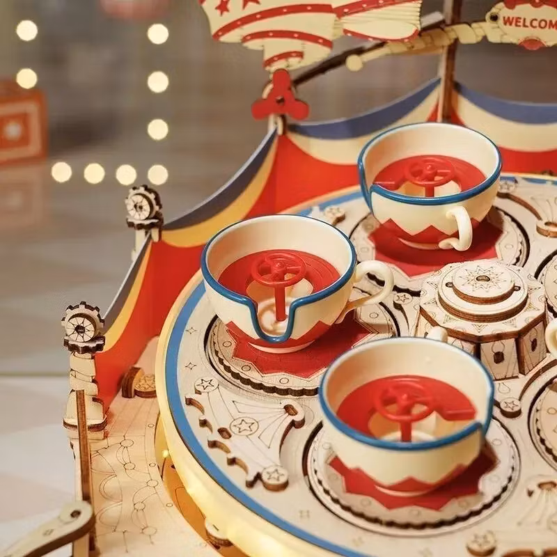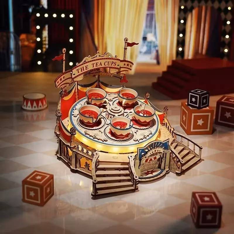 Det här är en mycket fin modell i trä. Modellen har en spiraltrappa, en snurrande avsats med fem tekoppar som roterar i takt till den romantiska melodin “Wind and Moon”.