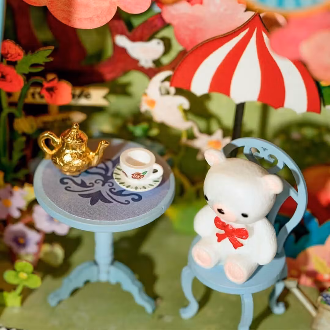 Här bygger du ihop en scen från ett afternoon tea-kalas. Solen skiner och alla är glada. Ett motiv som taget ur en gullig saga.
