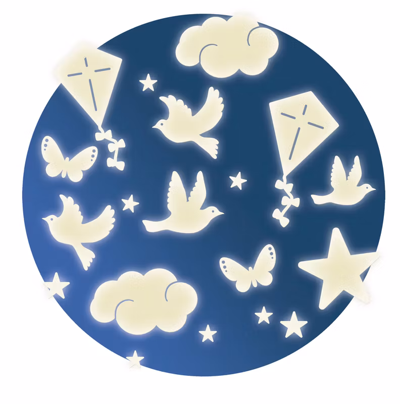 Självlysande tak- eller väggdekorationer som du sätter där du vill. Under dagen tar de upp solljuset för att i mörkret lysa.
