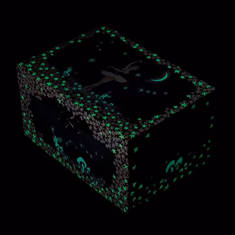 Fint, vackert smyckeskrin som lyser i mörkret! När du öppnar locket börjar en ballerina dansa till Mozart melodi. Här kan du förvara alla dina skatter.
