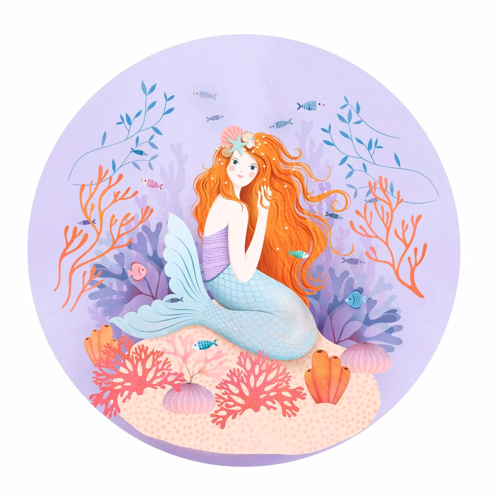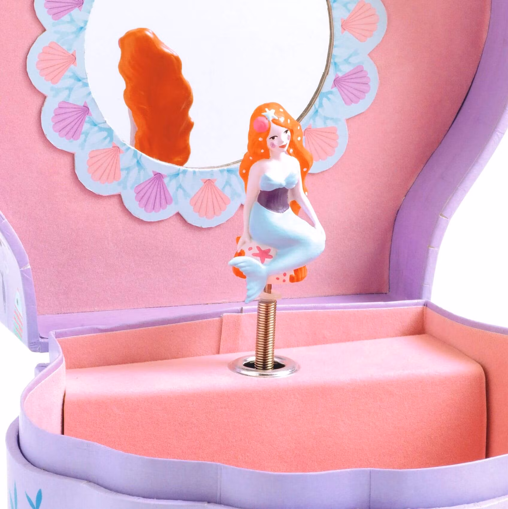 Ett underbart smyckeskrin format som en lila snäcka med en sjöjungfru på och en liten sjöjungfru som snurrar runt till en melodi när du öppnar skrinet. Med en liten spegel på insidan av locket och plats för smycken eller småsaker.