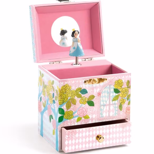 Sagolikt smyckeskrin och speldosa. Skrinet är i form av ett slott och målat i fina pastellfärger. Och är det Snövit som tittar ut genom fönstret högst upp i samspråk med en av sina små fågelvänner? Öppnar du locket så ser du henne dansa inne i slottet. Smyckeskrinet har två lådor där du kan förvara dina vackraste ting och förtrollande hemligheter. I locket finns också en liten spegel.