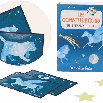 Stora Björn, Karlavagnen, Pegasus... Här får du tio små kort med olika stjärnkonstellationer att lära dig känna igen. I asken finns också självlysande stjärnor.