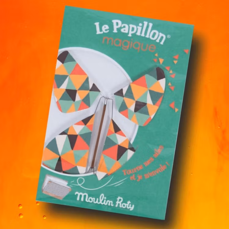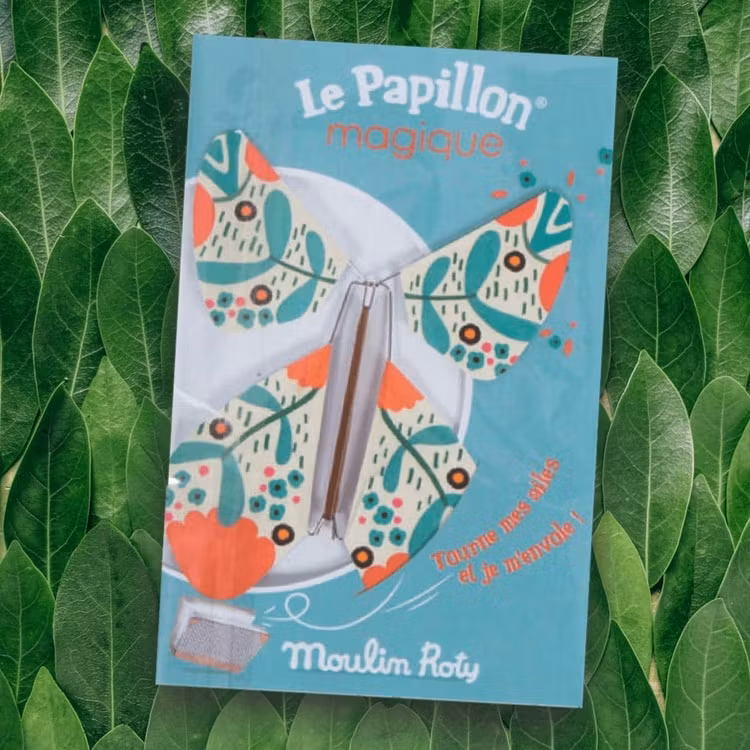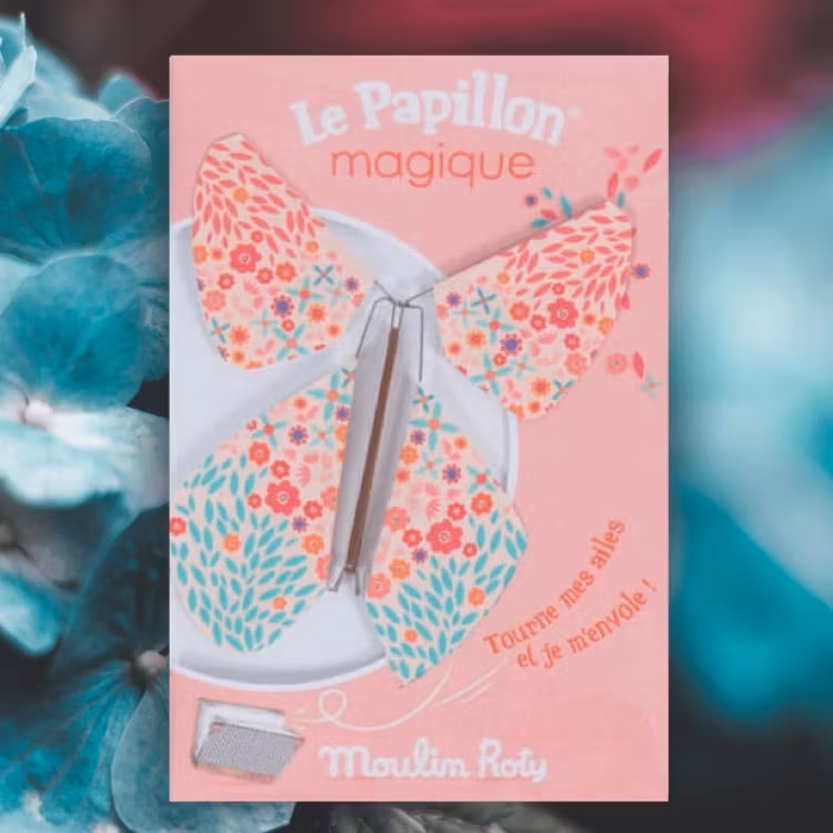 Pappfjärilar i vackert mönstrade papper. Fjärilen har ett gummiband som man snurrar upp. Släpp fjärilen och den fladdrar iväg. Du kan också lägga fjärilen upprullad i en bok som du sen öppnar... Rolig att leka med och vacker att sätta på väggen.