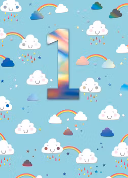Härligt kort med mängder av moln och regnbågar för att fira 1-åringen!