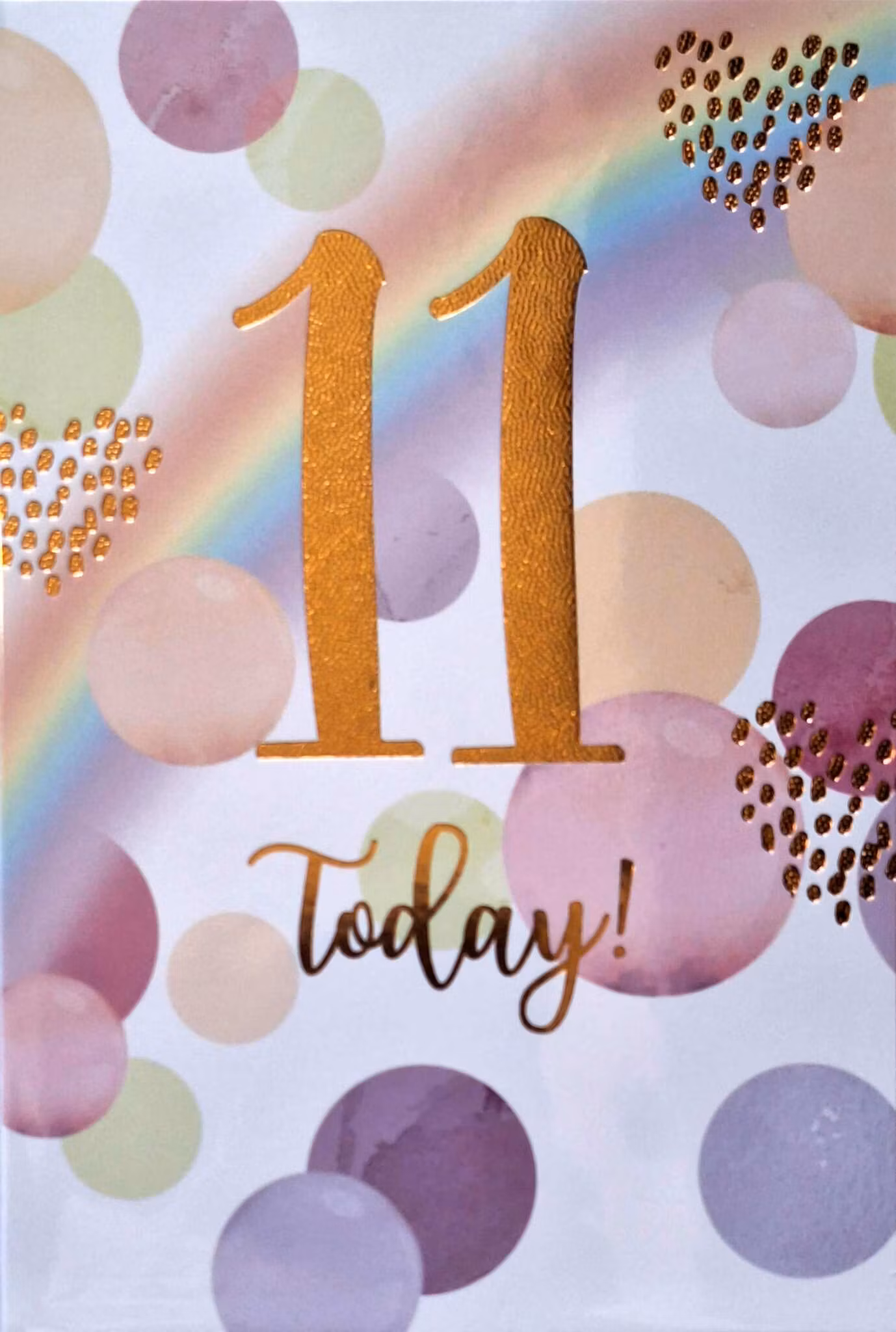 Härligt grattiskort med vackra pastellfärger, regnbåge och hjärtan. På kortet finns texten ”11 today”. I kortet finns texten ”Have a fantastic Birthday.”